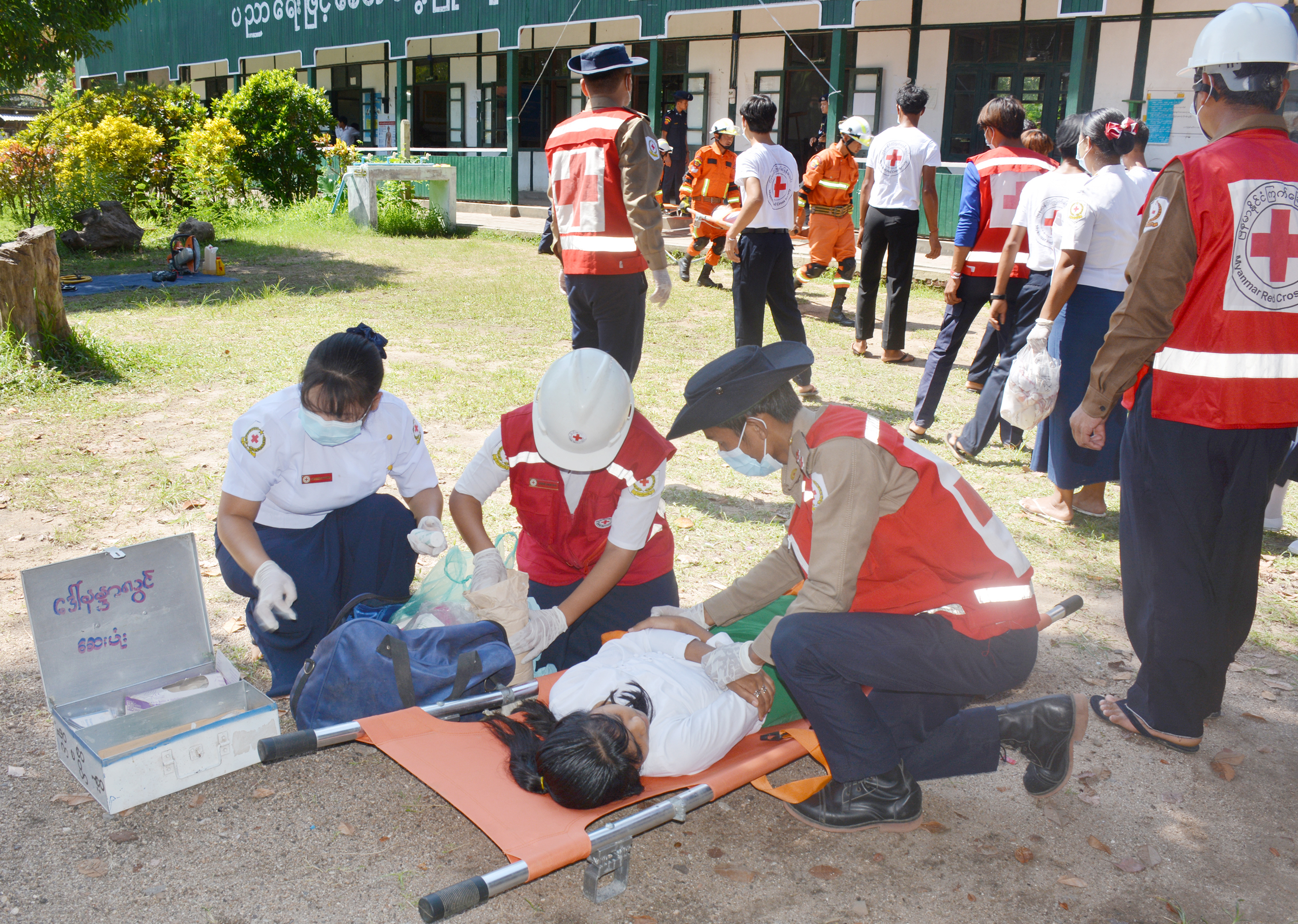 ဆက်လက်၍ ငလျင်ဘေးအန္တရာယ်သဏ္ဌာန်တူ ဇာတ်တိုက်လေ့ကျင့်ခြင်းအနေဖြင့် မြို့နယ်မီးသတ်ဦးစီးဌာနမှ တပ်ဖွဲ့ဝင်များက ရှာဖွေကယ်ဆယ်ရေးအတွက် သရုပ်ပြခြင်း၊ ကြက်ခြေနီတပ်ဖွဲ့ဝင်များက ရှေးဦးသူနာပြုစုနည်း သရုပ်ပြခြင်း၊ ငလျင်အန္တရာယ် ကင်းမဲ့ဇုန်မြေပုံကို ကျောင်းသား၊ ကျောင်းသူ (၃)ဦးစီပါဝင်သော အဖွဲ့(၃)ဖွဲ့မှ ရေးဆွဲစေပြီး ဆုလက်ဆောင်များ ချီးမြှင့်ခဲ့ကြသည်။