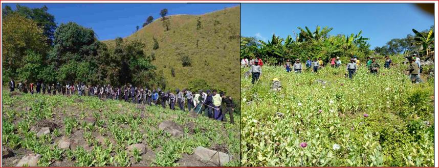 အလားတူ မိုင်းပန်မြို့နယ်၊ ကုန်းဆုံကျေးရွာ၏ တောင်ဘက် ၂ မိုင်ခန့်အကွာ၌ အမြင့် ၃ ပေခွဲခန့်ရှိ သီးပွင့်ဆဲ ဘိန်းခင်း ၁၆ ဧကခန့်အား လည်းကောင်း၊ ဟိုပုံးမြို့နယ်၊ ကျောက္ကချားကျေးရွာ၏ အနောက်မြောက်ဘက် ၈ မိုင်ခန့်အကွာတို့၌ အမြင့် ၆ လက်မမှ ၁ ပေခန့်ရှိ သီးပွင့်ဆဲ ဘိန်းခင်းစုစုပေါင်း ၁၄ ဧကခန့်အားလည်းကောင်း၊ ပင်လောင်းမြို့နယ်၊ ဝါးပြုံးကျေးရွာ၏ အနောက်တောင်ဘက် ၂ မိုင်ခန့်အကွာ၌ အမြင့် ၁ ပေခွဲခန့်ရှိ သီးပွင့်ဆဲ ဘိန်းခင်း စုစုပေါင်း ၁၅ ဧကခန့်အားလည်းကောင်း၊ တွန်းဇံမြို့နယ် လုံတပ်ကျေးရွာ၏ တောင်ဘက် ၂ မိုင်ခန့် အကွာတို့၌ အမြင့် ၃ ပေခန့်ရှိ သီးပွင့်ဆဲ ဘိန်းခင်းစုစုပေါင်း ၇ ဧကခန့်နှင့် ဂဲလ်မွှာလ်ကျေးရွာ၏ မြောက်ဘက် ၁ မိုင်ခန့်အကွာတို့၌ အမြင့် ၃ ပေခန့်ရှိ သီးပွင့်ဆဲ ဘိန်းခင်းစုစုပေါင်း ၈ ဒသမ ၃ ဧကခန့်အား လည်းကောင်း၊ ဖလမ်းမြို့နယ်၊ ဖိုင်ဆက်ကျေးရွာ အရှေ့မြောက်ဘက် ၇ မိုင်ခန့်အကွာ၌ အမြင့် ၂ ပေခန့်ရှိ ဘိန်းခင်း ၇ ဧကခန့်တို့အား သက်ဆိုင်ရာရဲတပ်ဖွဲ့များက ဖျက်ဆီးခဲ့ကြောင်း ရဲပြန်ကြားမှ သိရသည်။