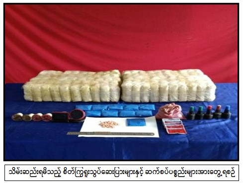 ဖေဖော်ဝါရီ ၂၃ ရက် မွန်းလွဲ ၃ နာရီတွင် မိုင်းဆတ်မြို့နယ်၊ မိုင်းခုတ်မြို့၊ တန့်ဆိုင်ကျေးရွာ အနီး၊ ငွေကျပ်သိန်း ၂၀၂၀ တန်ဖိုးရှိ စိတ်ကြွရူးသွပ်ဆေးပြား ၂၀၂,ဝ၀ဝ ၊ အနီရောင် ဆိုးဆေးမှုန့် သုည ဒသမ ဝ၈၁၆၅ ကီလို၊ FOOD COLOUR စာတန်းပါ နီညိုရောင်ဆိုးဆေးမှုန့် သုည ဒသမ ဝ၀၈ ကီလို၊ 1 အမှတ်အသားပါ တံဆိပ်တုံးအဝိုင်း ၃ ခု၊ 2 အမှတ်အသားပါတံဆိပ်တုံးအဝိုင်း ၁ ခု၊ မြင်းခေါင်းပုံပါ တံဆိပ်တုံးအဝိုင်း ၁ ခု၊ 999 စာတန်းပါ လေးထောင့်တံဆိပ်တုံး ၁ ခု၊ တံဆိပ်ရိုက်မင်ဆေးဘူးငယ် ၅ ဘူးတို့ကို တပ်မတော်မှ သိမ်းဆည်းရမိခဲ့သည်။