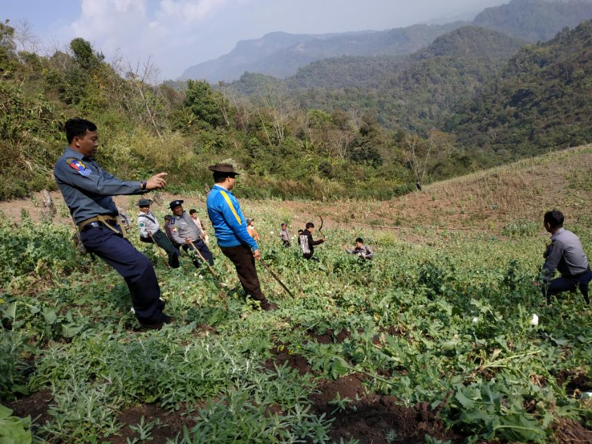 ရှမ်းပြည်နယ်၊ မိုင်းဆတ်ခရိုင်ရဲတပ်ဖွဲ့မှ တပ်ဖွဲ့ဝင်များပါဝင်သော ပူးပေါင်းအဖွဲ့သည် ဖေဖော်ဝါရီ ၁ ရက်တွင် မိုင်းဆတ်မြို့နယ် ရှုခင်းသာ(၂)နှင့် (၃)ကျေးရွာကြား၊ ရှုခင်းသာ(၁)နှင့် (၂)ကျေးရွာကြား၊ဟားကွယ်ကျေးရွာအနီးတစ်ဝိုက်၌ အမြင့် ၂ ပေခွဲမှ ၃ ပေခွဲခန့်ထိ သီးပွင့်ဆဲဘိန်းစိုက်ခင်း ၁၂ ဒသမ ၅ ဧကခန့်အား ဖျက်ဆီးခဲ့ကြောင်း သိရသည်။