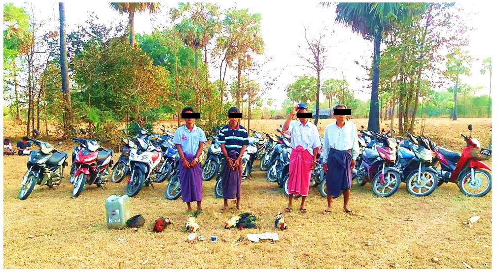 ထိုသို့ဖမ်းဆီးရာတွင် ကံလှိုင်၊ အောင်တင်၊ ခင်မောင်ရွှေ၊ ကျော်ဆန်းနိုင်တို့ လေးဦးအား တိုက်ကြက်ဖ ၅ ကောင်၊ ကြက်တိုက်လောင်းကစားရာတွင် အသုံးပြုသည့်ဆက်စပ်ပစ္စည်းများ၊ ဆိုင်ကယ်မျိုးစုံ အစီး ၄၀၊ ဖုန်း ၄ လုံး၊ လောင်းကြေးငွေစက္ကူရောရာ ၂၁၉၅၅၀ ကျပ်တို့ကို သိမ်းဆည်းရမိခဲ့သည့်အတွက် မြို့မြို့မရဲစခန်းမှ အမှုဖွင့်စစ်ဆေးလျက်ရှိကြောင်း သိရသည်။
