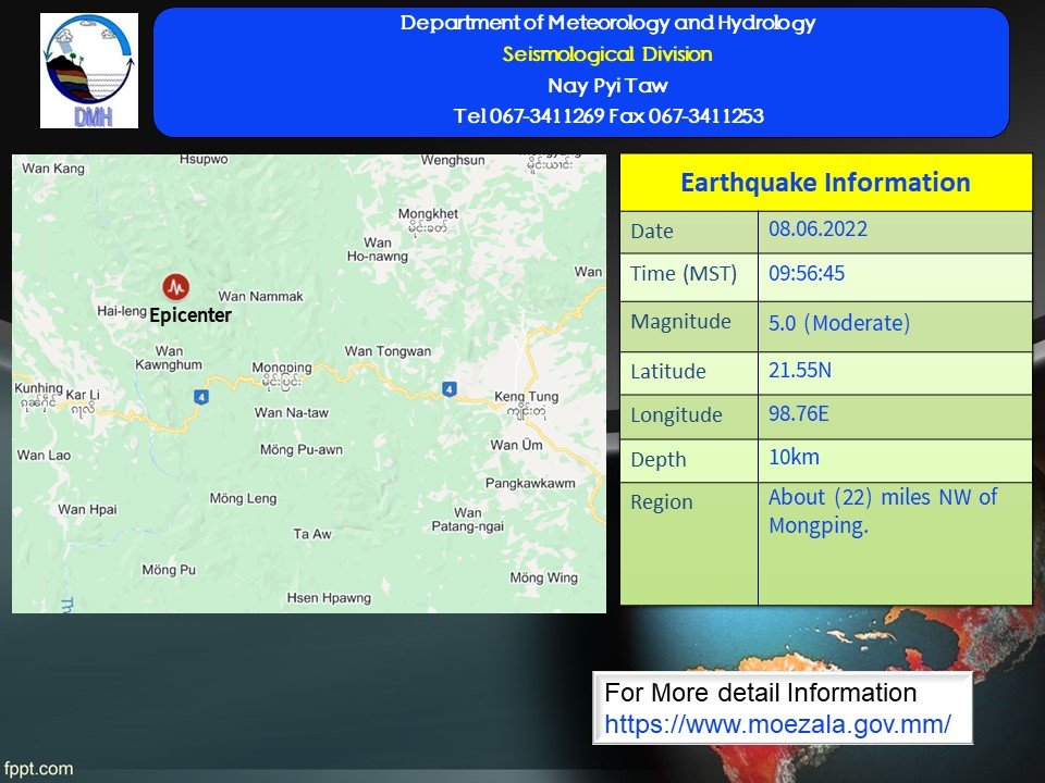 ၂၀၂၂ ခုနှစ်၊ ဇွန်လ (၈) ရက်နေ့၊ မြန်မာစံတော်ချိန် (၀၉)နာရီ၊ (၅၆)မိနစ်၊ (၄၅)စက္ကန့် အချိန်တွင် ကျိုင်းတုံမြေငလျင်စခန်းမှ အနောက်-အနောက်မြောက်ဘက် (၅၇)မိုင်ခန့်ကွာဝေးသော မြန်မာနိုင်ငံပြည်တွင်း (မိုင်းပြင်းမြို့၏ အနောက်မြောက်ဘက် (၂၂)မိုင်ခန့်အကွာ)၊ မြောက်လတ္တီတွဒ် (၂၁.၅၅) ဒီဂရီ၊ အရှေ့လောင်ဂျီတွဒ် (၉၈.၇၆)ဒီဂရီ၊ အနက် (၁၀)ကီလိုမီတာကို ဗဟိုပြု၍ အင်အားရစ်(ခ်)တာစကေး (၅.၀)အဆင့်ရှိ အင်အားအသင့်အတင့်ရှိသော မြေငလျင် တစ်ခုလှုပ်ရှားသွားကြောင်း တိုင်းထွာရရှိပါသည်။