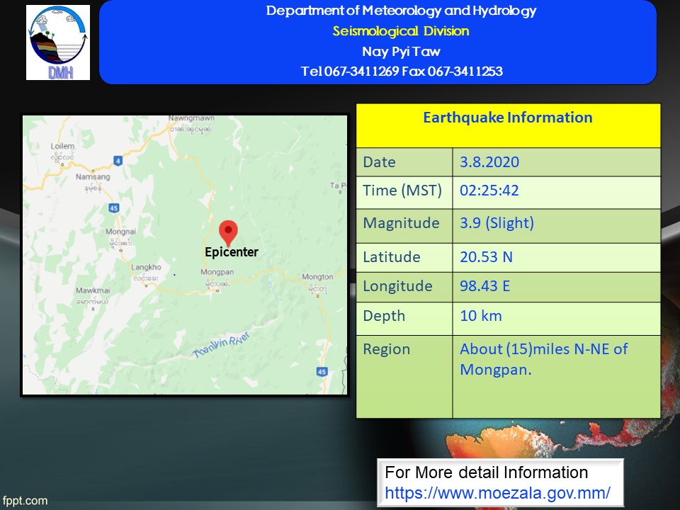 ယနေ့ မြန်မာစံတော်ချိန် ၂ နာရီ၊ ၂၅ မိနစ်၊ ၄၂ စက္ကန့်အချိန်တွင် နမ့်စန်မြေငလျင်စခန်းမှ အရှေ့တောင်ဘက် (၄၉)မိုင် ခန့်ကွာဝေးသော၊ မြန်မာနိုင်ငံပြည်တွင်း (မိုင်းပန်မြို့၏ မြောက်-အရှေ့မြောက်ဘက် (၁၅)မိုင် ခန့်အကွာ)၊ မြောက်လတ္တီတွဒ် (၂၀.၅၃) ဒီဂရီ၊ အရှေ့လောင်ဂျီတွဒ် (၉၈.၄၃)ဒီဂရီ၊ အနက် (၁၀) ကီလိုမီတာကိုဗဟိုပြု၍ အင်အားရစ်(ခ်)တာ စကေး ၃ ဒသမ ၉ အဆင့်ရှိ အင်အားအနည်းငယ်ရှိသော မြေငလျင်တစ်ခု လှုပ်ရှားသွားကြောင်း မိုးလေဝသနှင့် ဇလဗေဒညွှန်ကြားမှုဦးစီးဌာန၏ ထုတ်ပြန်ချက်အရ သိရသည်။