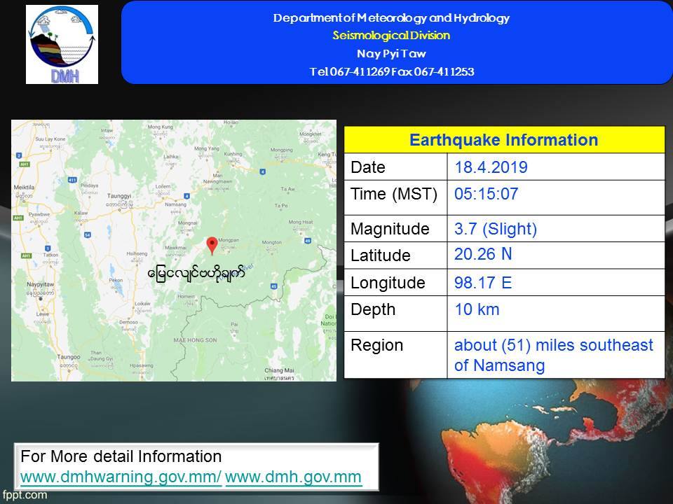 ၂၀၁၉ ခုနှစ်၊ ဧပြီလ (၁၈)ရက်နေ့၊ မြန်မာစံတော်ချိန် (ဝ၅)နာရီ၊ (၁၅)မိနစ်၊ (ဝ၇)စက္ကန့် အချိန်တွင် နမ့်စန်မြေငလျင်စခန်းမှ အရှေ့တောင်ဘက် (၅၁)မိုင်ခန့် ကွာဝေးသော မြန်မာနိုင်ငံပြည်တွင်း (မိုင်းပန်မြို့၏ အနောက်-အနောက်တောင်ဘက် (၁၃)မိုင်ခန့်အကွာ) မြောက်လတ္တီတွဒ် (၂၀.၂၆) ဒီဂရီ၊ အရှေ့လောင်ဂျီတွဒ် (၉၈.၁၇) ဒီဂရီ၊ အနက်(၁၀)ကီလိုမီတာကို ဗဟိုပြု၍ အင်အားရစ်(ခ်)တာစကေး (၃.၇) အဆင့်ရှိ အင်အား အနည်းငယ်ရှိသော မြေငလျင်တစ်ခု လှုပ်ရှားသွားကြောင်း တိုင်းထွာရရှိကြောင်း မိုးဇလမှ ထုတ်ပြန်ထားသည်။