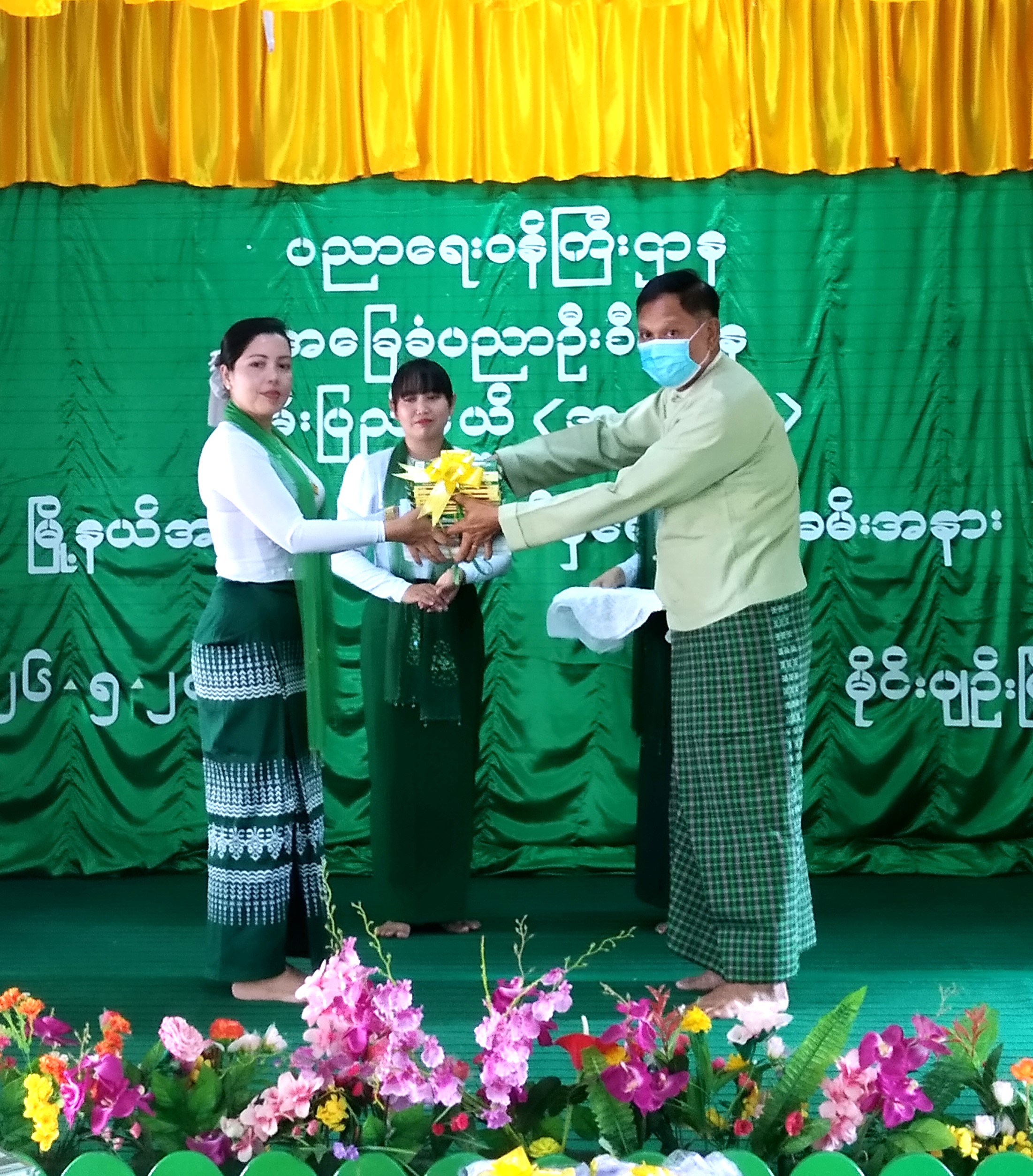 ဆက်လက်၍ မိုင်းပျဉ်းမြို့ မြို့မိ၊မြို့ဖ ဦးစိုင်းထွန်းစိန်က အမှာစကားပြောကြားပြီး ထက်၊လယ်၊မူ ကျောင်းအုပ်ကြီးများအား နိုင်ငံတော်မှ အခမဲ့ထောက်ပံ့သော ဗလာစာအုပ်၊ ခဲတံ၊ ပုံနှိပ်စာအုပ်နှင့် ကျောင်းဝတ်စုံများ အားပေးအပ်သည်။