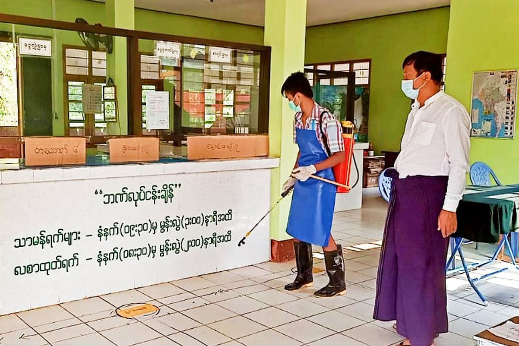 မိဘပင်စင်စားများ ပင်စင်လစာငွေ လာရောက်ထုတ်ယူသည့်အခါ ကိုဗစ်-၁၉ ရောဂါ ကူးစက်မှုအန္တရာယ်ကင်းရှင်းစေရန်အတွက် ရှမ်းပြည်နယ်အရှေ့ပိုင်း တာချီလိတ်ခရိုင် မိုင်းယောင်းမြို့နယ် မြန်မာ့စီးပွားဘဏ်၌ ပိုးသတ်ဆေးဖျန်းခြင်းကို ဧပြီ ၂၀ ရက် နံနက် ၇ နာရီက ကျန်းမာရေးဝန်ထမ်းများက ဆောင်ရွက်ပေးခဲ့ကြောင်း သိရသည်။