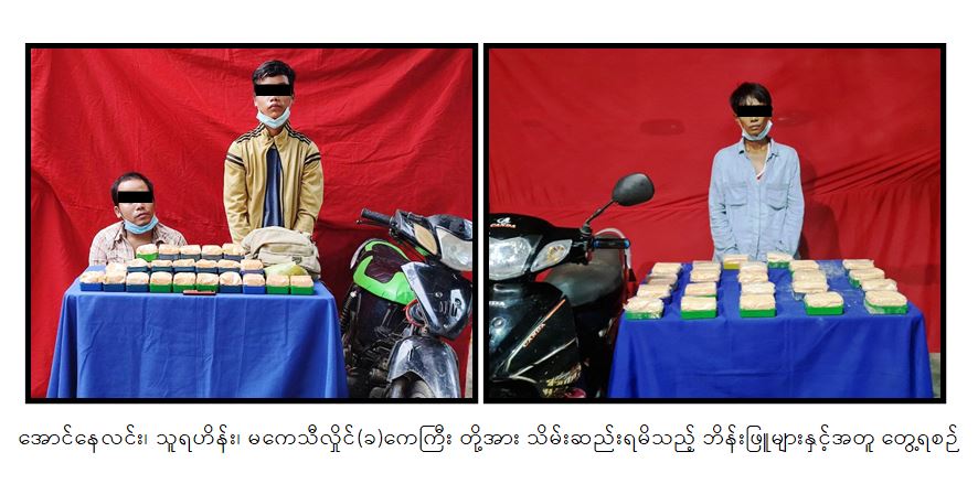 မူးယစ်ဆေးဝါးတားဆီးနှိမ်နင်းရေး ရဲတပ်ဖွဲ့မှ တပ်ဖွဲ့ဝင်များပါဝင်သော ပူးပေါင်းအဖွဲ့သည် ဩဂုတ် ၆ ရက် နံနက် ၁၁နာရီ ၄၅ မိနစ်တွင် မိုးညှင်းမြို့နယ်၊ ရန်ကုန်-မြစ်ကြီးနားသွားကားလမ်း၊ နန့်စီးအောင် ပူးပေါင်းစစ်ဆေးရေးဂိတ် အနီးတွင် ခရီးသည်တင်မော်တော်ယာဉ်ကို ရပ်တန့်စစ်ဆေးရှာဖွေရာ ခရီးသည် မမေသွယ်ဦး သယ်ဆောင်လာသည့် ကျောပိုးအိတ်အတွင်းမှ ဘိန်းဖြူ သုည ဒသမ ၂၁ ကီလို ကိုလည်းကောင်း၊ ထိုနေ့ မွန်းလွဲ ၂ နာရီတွင် မြစ်ကြီးနားမြို့နယ်၊ မန္တလေး-မြစ်ကြီး နားသွားကားလမ်း၊ (၂၁)မိုင်ပူးပေါင်းစစ်ဆေးရေးဂိတ်တွင် သူရဟိန်း မောင်းနှင်ပြီး အောင်နေလင်း လိုက်ပါလာသည့် မော်တော်ဆိုင်ကယ်ကို ရပ်တန့်ရှာဖွေစစ်ဆေးရာ ဘိန်းဖြူ သုည ဒသမ ၂၂ ကီလို သိမ်းဆည်းရမိခဲ့ပြီး အလားတူ ည ၈နာရီ ၁၅ မိနစ်တွင် မြစ်ကြီးနားမြို့၊ တပ်ကုန်း(ထွယ်ဆန်)ရပ်ကွက်၊ ရွှေလမ်းမကြီးတွင် မကေသီလှိုင်(ခ) ကေကြီး မောင်းနှင်လာသည့် မော်တော်ဆိုင်ကယ်ကို ရပ်တန့်ရှာဖွေစစ်ဆေးရာ ဘိန်းဖြူ သုည ဒသမ ၂၂ ကီလို တို့ကိုလည်းကောင်း။