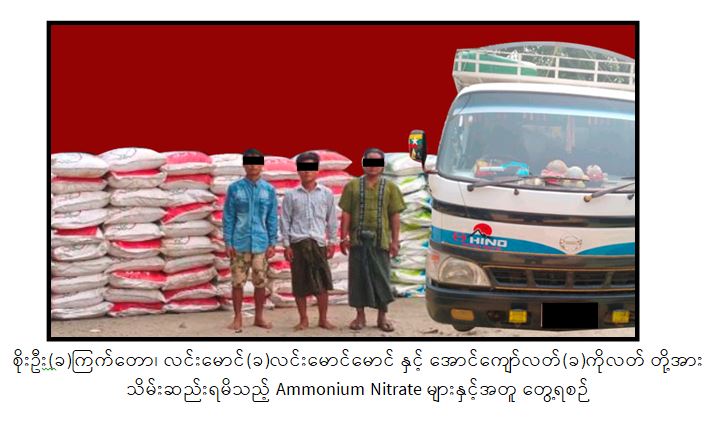 ကချင်ပြည်နယ်ရဲတပ်ဖွဲ့ဝင်များ ပါဝင်သော ပူးပေါင်းအဖွဲ့သည် ဧပြီ ၂၈ ရက် နံနက် ၉ နာရီခွဲတွင် မိုးညှင်းမြို့နယ်၊ အင်ကြင်းကုန်းကျေးရွာအုပ်စု၊ အင်ကြင်းကုန်းကျေးရွာအနီးတွင် အောင်ကျော်လတ်(ခ)ကိုလတ် မောင်းနှင်ပြီး လင်းမောင်(ခ)လင်းမောင်မောင်နှင့် စိုးဦး(ခ)ကြက်တောတို့ လိုက်ပါလာသည့် Hino အမျိုးအစားမော်တော်ယာဉ်ကို ရပ်တန့်စစ်ဆေးရှာဖွေရာ Ammonium Nitrate ၆,၀၀၀ ကီလို ကိုလည်းကောင်း၊ ထို့အတူ ယင်းနေ့ ညနေ ၅ နာရီတွင် မူးယစ်ဆေးဝါးတားဆီး နှိမ်နင်းရေးရဲတပ်ဖွဲ့ဝင်များ ပါဝင်သော ပူးပေါင်းအဖွဲ့သည် ပြည်ကြီးတံခွန်မြို့နယ်၊ သင်ပန်းကုန်း ရပ်ကွက်၊ ၄၇(B)လမ်း၊ ၁၂၁ လမ်းနှင့် ၁၂၂ လမ်းကြား၊ အမှတ်(၃၉/၃)နေ ဦးတူး(ခ)ဝင်းစိုး၏ နေအိမ် သို့ ဝင်ရောက်ရှာဖွေရာ စိတ်ကြွရူးသွပ်ဆေးပြား ၁၂,၀၉၀ ကိုလည်းကောင်း၊ ထို့ပြင် ယင်းနေ့ နံနက် ၁၁ နာရီတွင် မူးယစ်ဆေးဝါး တားဆီးနှိမ်နင်းရေးရဲတပ်ဖွဲ့ဝင်များ ပါဝင်သောပူးပေါင်းအဖွဲ့သည် ရန်ကင်း မြို့နယ်၊ အမှတ်(၂)ရပ်ကွက်၊ စည်ပင်လမ်းသစ်လမ်းရှိ စားသောက်ဆိုင်အနီးတွင် သက်ဦး ခိုင်(ခ)ဖွာရွတ်နှင့် လှမျိုးဦး(ခ) အကြီးကောင်တို့ ၂ ဦးကို မသင်္ကာဖွယ်တွေ့ရှိသဖြင့် စစ်ဆေး ရှာဖွေရာ စိတ်ကြွရူးသွပ်ဆေးပြား ၁,၂၀၀ ကိုလည်းကောင်း၊ ထို့ပြင် ယင်းနေ့ မွန်းလွဲ ၃ နာရီတွင် မူးယစ်ဆေးဝါးတားဆီးနှိမ်နင်းရေးရဲတပ်ဖွဲ့ဝင်များ ပါဝင်သော ပူးပေါင်းအဖွဲ့သည် ပင်လောင်းမြို့နယ်၊ ဘုရားဖြူကျေးရွာအုပ်စု၊ နောင်တောကျေးရွာအနီး၊ နောင်တရား- အောင်ပန်းသွား ကားလမ်းတွင် ခွန်အောင်သိန်း မောင်းနှင်ပြီး ခွန်သန်းအောင် လိုက်ပါလာသည့် မော်တော်ဆိုင်ကယ်ကို ရပ်တန့်စစ်ဆေးရှာဖွေရာ စိတ်ကြွရူးသွပ်ဆေးပြား ၈၀,၀၀၀ ကိုလည်းကောင်း သိမ်းဆည်း ရမိခဲ့သဖြင့် ၎င်းတို့အား မူးယစ်ဆေးဝါးနှင့် စိတ်ကိုပြောင်းလဲစေသော ဆေးဝါးများဆိုင်ရာဥပဒေအရ အရေးယူ ထားကြောင်း သိရသည်။