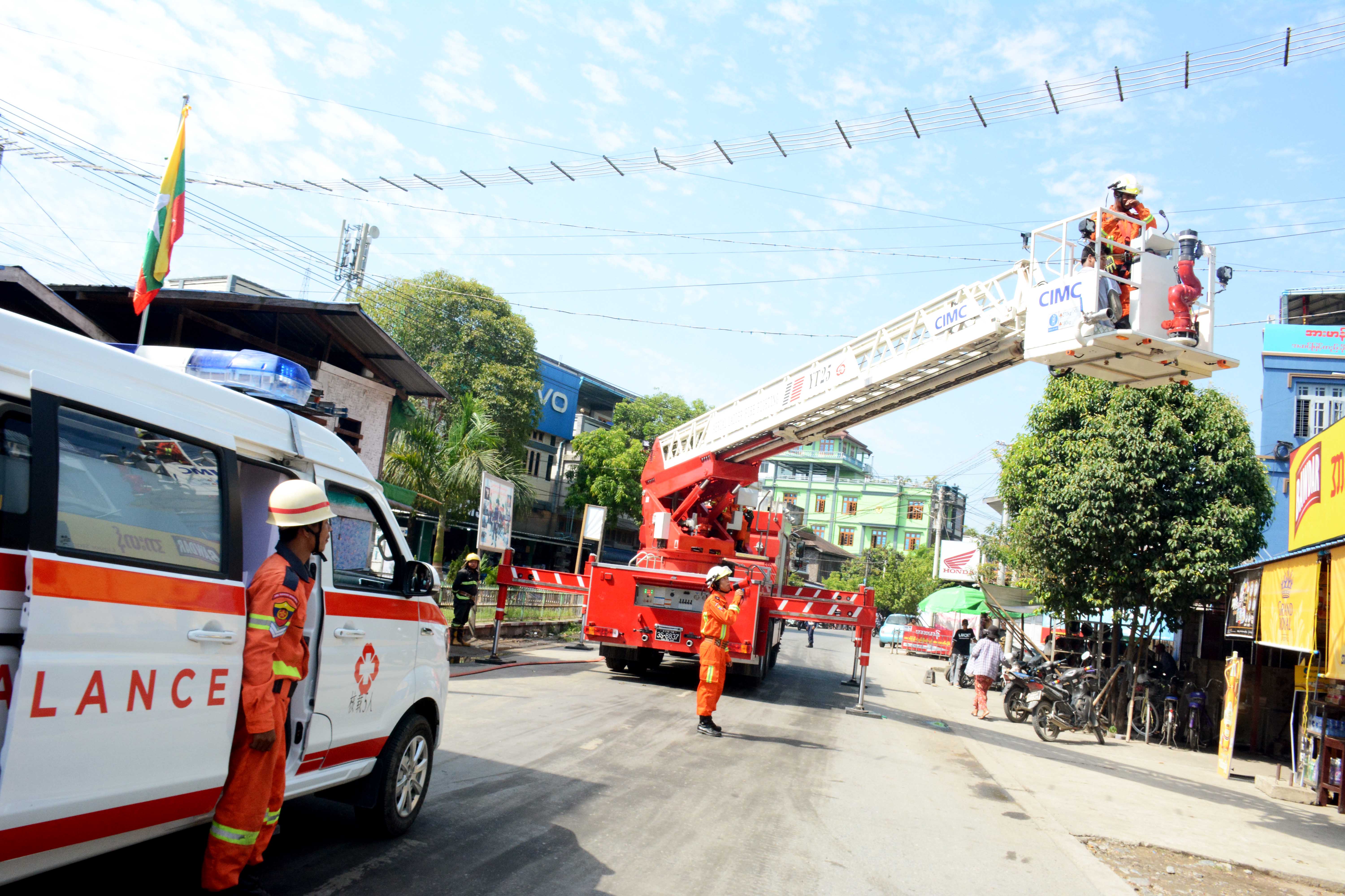 ထို့နောက် အထပ်မြင့်တိုက်များ မီးလောင်မှုဖြစ်ပွားပြီးနောက် ထိခိုက်ဒဏ်ရာများရရှိပြီး ပိတ်မိနေသည့် လူနာများအား ရှာဖွေကယ်ဆယ်ရေးလုပ်ငန်း၊ မီးငြိမ်းသတ်ရေးလုပ်ငန်းနှင့် လူနာတင်ယာဉ်ဖြင့် သယ်ဆောင်ခြင်း လုပ်ငန်းများဖြစ်သည့် သရုပ်ပြသခြင်းများကို ဆက်လက်ဆောင်ရွက်ရာ တက်ရောက် လာကြသူများက စိတ်ပါဝင်စားစွာ ကြည့်ရှုအားပေးခဲ့ကြကြောင်း သိရသည်။