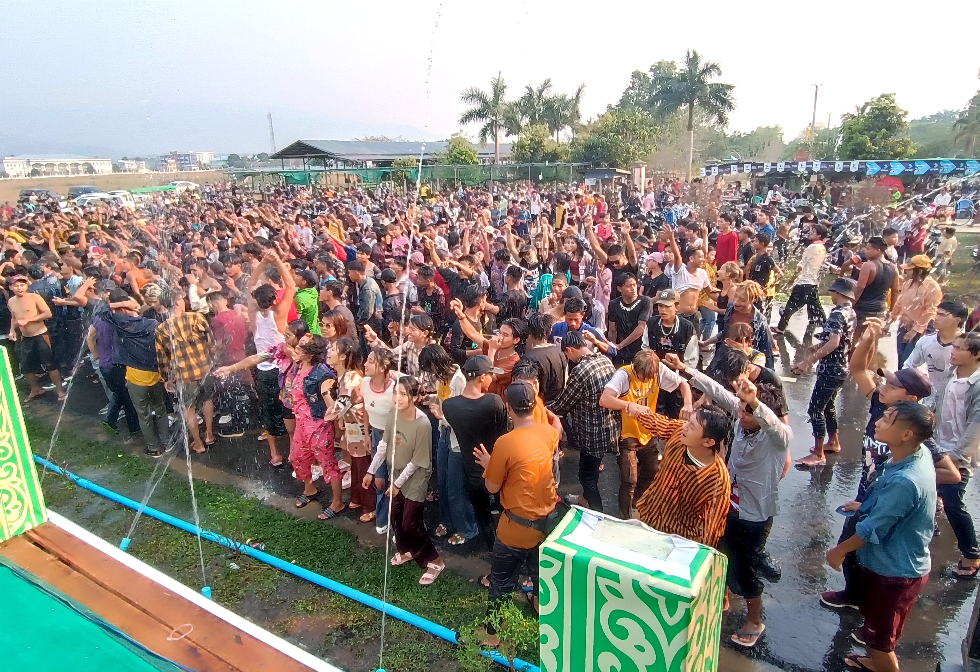 ကချင်ပြည်နယ် မိုးညှင်းမြို့ စုပေါင်းရုံးရှေ့ရှိ ခရိုင်ဗဟိုသင်္ကြန်မဏ္ဍပ်၌ ဧပြီ ၁၅ ရက် သင်္ကြန်အကြတ်နေ့ နံနက်ပိုင်းတွင် ယိမ်းအဖွဲ့များမှ အကအလှများ၊ တေးသီချင်းများဖြင့် ပြည်သူများ အေးချမ်းပျော်ရွှင်စွာ ရေကစားနေမှုကို တွေ့ရစဉ်။