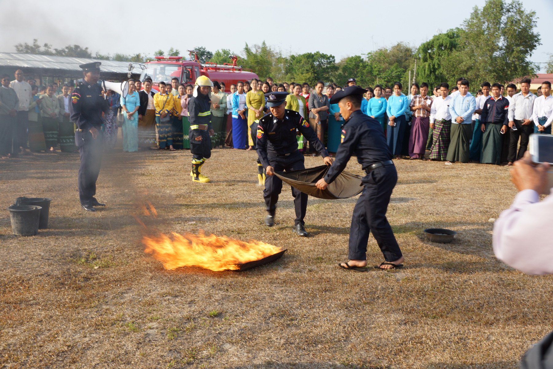 ဆက်လက်၍ လက်တွေ့မီးငြှိမ်းသတ်နည်း သရုပ်ပြသခြင်းကို ခရိုင်အထွေထွေအုပ်ချုပ်ရေး ဦးစီးဌာနရုံးရှေ့ရှိ မြေကွက်လပ်တွင်ကျင်းပရာ မီးလောင်မှုအား ရေစိုအဝင်ဖြင့် အုပ်၍ငြှိမ်းသတ်နည်း၊ မီးသတ်ဆေးဘူးအသုံးပြု၍ငြှိမ်းသတ်နည်း၊ ဂက်စ်ဘူးမီးလောင်မှုအား လက်ပိတ်ငြှိမ်းသတ်နည်းနှင့်မီး သတ်ဘောလုံးအသုံးပြု၍ ငြှိမ်းသတ်နည်းများကို တက်ရောက်လာသူများနှင့်အတူ လက်တွေ့စမ်း သပ်သရုပ်ပြ လေ့ကျင့်ခဲ့ကြကြောင်း သိရသည်။