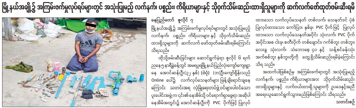 မြို့နယ်အချို့၌ အကြမ်းဖက်မှုလုပ်ရပ်များတွင် အသုံးပြုမည့် လက်နက်၊ ပစ္စည်း၊ ကိရိယာများနှင့် သိုဝှက်သိမ်းဆည်းထားရှိသူများကို ဆက်လက်ဖော်ထုတ်ဖမ်းဆီးရမိ
