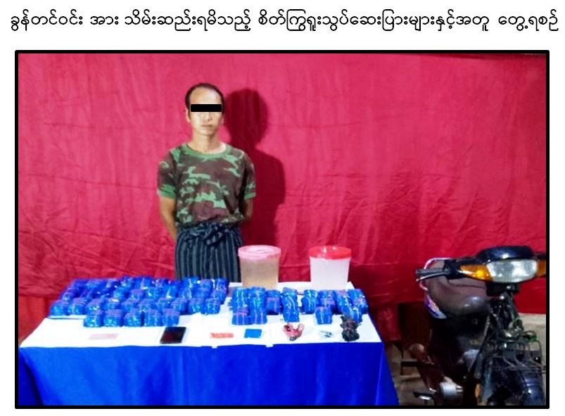 မူးယစ်ဆေးဝါးတားဆီးနှိမ်နင်းရေး ရဲတပ်ဖွဲ့ဝင်များပါဝင်သော ပူးပေါင်းအဖွဲ့သည် ဩဂုတ် ၂၆ ရက် ည ၆ နာရီ မိနစ် ၅၀ တွင် ဒဂုံမြို့သစ်(မြောက်ပိုင်း)မြို့နယ်၊ (၂၈)ရပ်ကွက်၊ ပြည်ထောင်စုလမ်းနှင့် ဆရာစံလမ်းထောင့်တွင် မသင်္ကာဖွယ်တွေ့ရှိသူ စောနောင်(ခ)ကိုထက်(ခ)အောင်လေး နှင့် သန်းနိုင်ဇော်(ခ)ကိုနိုင် တို့အား စစ်ဆေးရှာဖွေရာ ၎င်းတို့ထံမှ စိတ်ကြွရူးသွပ်ဆေးပြား ၄,၀၀၀ ကိုလည်းကောင်း၊ ထို့ပြင် ဩဂုတ် ၂၇ ရက် နံနက် ၁၀ နာရီတွင် ပူးပေါင်းအဖွဲ့သည် ဟိုပုံးမြို့နယ်၊ တောင်ကြီး-လွိုင်လင်သွားကားလမ်း ရွာသစ်ကျေးရွာအနီးတွင် ထွန်းထွန်းဦး(ခ)အာဇွင်း မောင်းနှင်ပြီး ယွန်းဂျူလိုင်ဖူး လိုက်ပါလာသည့် ဆိုင်ကယ်ကို စစ်ဆေးရှာဖွေရာ ၎င်းတို့ထံမှ စိတ်ပြောင်းဆေးဝါး Happy Water သုည ဒသမ ၇၈၃ ကီလို၊ ကက်တမင်း သုည ဒသမ ၀၄၅ ကီလို သိမ်းဆည်း ရမိခဲ့ပြီး ကွင်းဆက်အရ နံနက် ၁၁ နာရီခွဲတွင် စိုင်းစွမ်ဆိုင်မိုင်းအား တောင်ကြီးမြို့၊ ကံကြီးရပ်ကွက်၊ ရွှေတောင်ကြားအိမ်ရာတွင် လည်းကောင်း၊ မွန်းလွဲ ၁၂ နာရီ ၁၅ မိနစ်တွင် မျိုးမင်းထက်(ခ)ကိုထက် အား တောင်ကြီးမြို့၊ ကျောင်းကြီးစုရပ်ကွက်တွင် ကက်တမင်း သုည ဒသမ ၀၀၉ ကီလိုကို လည်းကောင်း၊ ထို့ပြင် ယင်းနေ့ မွန်းလွဲ ၁ နာရီ ၄၅ မိနစ်တွင် ပူးပေါင်းအဖွဲ့သည် ပင်လောင်းမြို့၊ ဈေးတန်းရပ်ကွက်ရှိ ကားဂိတ်တွင် ဆိုင်ကယ်နှင့် ပါဆယ်ပစ္စည်းများ လာရောက်ပို့ဆောင်သူ ခွန်တင်ဝင်းအား စစ်ဆေးရှာဖွေရာ စိတ်ကြွရူးသွပ်ဆေးပြား ၁၁၁,၀၀၀ ကိုလည်းကောင်း သိမ်းဆည်းရမိခဲ့သဖြင့် ၎င်းတို့အား မူးယစ်ဆေးဝါးနှင့် စိတ်ကိုပြောင်းလဲစေသော ဆေးဝါးများဆိုင်ရာ ဥပဒေအရ အရေးယူထားကြောင်း သိရသည်။
