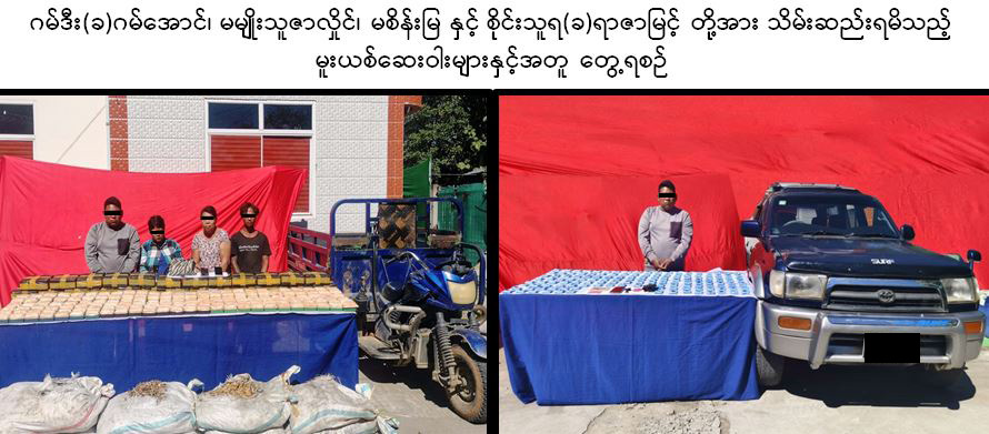 မူးယစ်ဆေးဝါးတားဆီးနှိမ်နင်းရေး ရဲတပ်ဖွဲ့ဝင်များပါဝင်သော ပူးပေါင်းအဖွဲ့သည် နိုဝင် ဘာ ၁၀ ရက် ညနေ ၅ နာရီ ၅၅ မိနစ်တွင် မိုးညှင်းမြို့နယ်၊ ပင်လုံကျေးရွာအုပ်စု၊ နန့်စီးအောင် ကျေးရွာအနီးတွင် စိုင်းသူရ(ခ)ရာဇာမြင့် မောင်းနှင်ပြီး မစိန်းမြ နှင့် မမျိုးသူဇာလှိုင်(ခ)သူဇာ လိုက်ပါလာသည့် သုံးဘီးဆိုင်ကယ်ကို စစ်ဆေးရှာဖွေရာ ဘိန်းဖြူ ၄ ဒသမ ၄ ကီလို သိမ်းဆည်းရမိခဲ့ပြီး ကွင်းဆက်အရ နိုဝင်ဘာ ၁၁ ရက် နံနက် ၉ နာရီတွင် မိုးညှင်းမြို့၊ အောင်သပြေ (၁)ရပ်ကွက်တွင် ဂမ်ဒီး(ခ)ဂမ်အောင် အား စိတ်ကြွရူးသွပ်ဆေးပြား ၂၈,၅၀၀၊ TOYOTA HILUX SURF မော်တော် ယာဉ်တစ်စီးကိုလည်းကောင်း၊ အလားတူ နိုဝင်ဘာ ၁၀ ရက် ညနေ ၄ နာရီတွင် မူးယစ်ဆေးဝါး တားဆီးနှိမ်နင်းရေးရဲတပ်ဖွဲ့ဝင်များ ပါဝင်သော ပူးပေါင်းအဖွဲ့သည် မြောက်ဥက္ကလာပမြို့ နယ်၊ (ဈ) ရပ်ကွက်၊ သုဓမ္မာလမ်း၊ သီရိရတနာလက်လီ/လက်ကားဈေးဝင်းရှိ အောင်မြင့်ဦး(ခ) အောင်ကြီးနှင့် မစိုးစိုးလှိုင်(ခ)မစိုး တို့၏ အခန်းကို ဝင်ရောက်ရှာဖွေရာ စိတ်ကြွရူးသွပ်ဆေးပြား ၃၀၀,၀၀၀ ကို လည်းကောင်း၊ ထို့ပြင် နိုဝင်ဘာ ၁၃ ရက် ည ၈ နာရီတွင် မူးယစ်ဆေးဝါးတားဆီးနှိမ်နင်း ရေးရဲတပ်ဖွဲ့ဝင်များပါဝင်သော ပူးပေါင်းအဖွဲ့သည် ဘားအံမြို့နယ်၊ မိသရောင်ကျေးရွာအုပ်စု၊ နောင်ထီလား ကျေးရွာရှိ မနန်းမြညွန့်၏ နေအိမ်ကို ဝင်ရောက်ရှာဖွေရာ ၎င်းထံမှ စိတ်ကြွရူးသွပ်ဆေးပြား ၄,၆၀၀ ကိုလည်းကောင်း၊ ထို့ပြင် ယင်းနေ့ နံနက် ၈ နာရီခွဲတွင် ပူးပေါင်းအဖွဲ့သည် တာချီလိတ်မြို့၊ ရန်အောင် မြေရပ်ကွက်တွင် ကျော်ရဲအောင် (ခ)အောင်ဇေ မောင်းနှင်ပြီး ဝင်းနိုင်လင်း လိုက်ပါလာသည့် ဆိုင်ကယ်ကို စစ်ဆေးရှာဖွေရာ အိုက်စ်(မက်သ်အဖက်တမင်း) ၃ ကီလို သိမ်းဆည်းရမိခဲ့သဖြင့် ၎င်းတို့အား မူးယစ်ဆေးဝါးနှင့်စိတ်ကို ပြောင်းလဲစေသော ဆေးဝါးများဆိုင်ရာ ဥပဒေအရ အရေးယူထားကြောင်း သတင်းရရှိသည်။