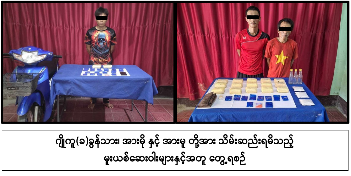 မူးယစ်ဆေးဝါး တားဆီးနှိမ်နင်းရေး ပူးပေါင်းအဖွဲ့သည် မေ ၄ ရက် မွန်းလွဲ ၃ နာရီတွင် တာချီလိတ်မြို့၊ ဝိန်းကျောက်ရပ်ကွက်တွင် ဂျိုကူ (ခ) ခွန်သား မောင်းနှင်လာသည့် မော်တော်ဆိုင်ကယ်ကို ရပ်တန့်စစ်ဆေးရှာဖွေရာ စိတ်ကြွရူးသွပ်ဆေးပြား ၄,၀၀၀ ကိုလည်းကောင်း၊ အလားတူ ပူးပေါင်းအဖွဲ့သည် ညနေ ၅ နာရီတွင် တာချီလိတ်မြို့၊ ပုန်းထွန်ရပ်ကွက်ရှိ အားမို၏ နေအိမ်ကို ဝင်ရောက်ရှာဖွေရာ စိတ်ကြွရူးသွပ်ဆေးပြား ၃၄,၀၀၀ ကိုလည်းကောင်း၊ ဘိန်းဖြူ သုည ဒသမ ၀၆ ကီလို ကိုလည်းကောင်း၊ ထို့ပြင်ပူးပေါင်းအဖွဲ့သည် နံနက် ၁၁ နာရီတွင် တောင်ကြီးမြို့၊ ကျောင်းကြီးစုရပ်ကွက်ရှိ မထက်ထက်ဖြိုးလင်း၏ နေအိမ်ကို ဝင်ရောက်ရှာဖွေရာ စိတ်ကြွရူးသွပ်ဆေးပြား ၅,၂၀၀ ကိုလည်းကောင်း သိမ်းဆည်းရမိခဲ့သဖြင့် ၎င်းတို့အား မူးယစ်ဆေးဝါးနှင့် စိတ်ကိုပြောင်းလဲစေသော ဆေးဝါးများဆိုင်ရာဥပဒေအရ အရေးယူထားကြောင်း သိရသည်။