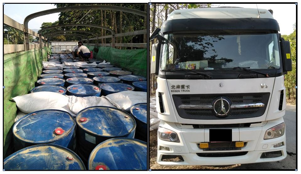 အလားတူ မေ ၁၈ ရက် မွန်းလွဲပိုင်းက သီပေါမြို့နယ်ရဲတပ်ဖွဲ့မှူးရုံးမှ တပ်ဖွဲ့ဝင်များ ပါဝင်သော ပူးပေါင်းအဖွဲ့သည် သီပေါမြိုနယ်၊ နောင်အန်ကျေးရွာအုပ်စု၊ ပန်ဆောက်ကျေးရွာ အနီး၊ သီပေါ-လားရှိုးသွား ကားလမ်းတွင် ရပ်တန့်ထားသော BEIBEN TRUCK အမျိုးအစား ၁၈ ဘီးတွဲမော်တော်ယာဉ်ကို ရှာဖွေစစ်ဆေးရာ သံပီပါ ၆၈ လုံးအတွင်းမှ အီသိုင်းအီသာ ၁၀,၂၀ဝ လီတာကိုလည်းကောင်း၊