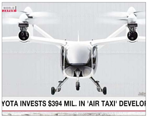 မြို့တော်ကြီးများဝန်းကျင်၌ ခေါက် တုံ့ခေါက်ပြန်သွားနိုင်သည့် လေယာဉ်ပျံများ တီထွင်ရန် အမေရိကန်နိုင်ငံ ကယ်လီဖိုးနီးယားပြည်နယ်မှ Joby Aviation သို့ ကူညီမည်ဟု ဂျပန် မော်တော်ကားကုမ္ပဏီတိုယိုတာကပြောသည်။ တိုယိုတာကုမ္ပဏီက အဆိုပါမိုးပျံယာဉ်များ တည်ဆောက် ရေးစီမံကိန်း၌ အမေရိကန်ဒေါ်လာ ၃၉၄ သန်း ထည့်ဝင်ခဲ့ရာ ထိပ်တန်း ရင်းနှီးမြှုပ်နှံသူ ဖြစ်လာခဲ့သည်။ တိုယို တာကုမ္ပဏီက လျှပ်စစ်ကားနည်း ပညာ၊ ထုတ်လုပ်မှု၊ အရည်အသွေး နှင့် ကုန်ကျစရိတ်ထိန်းချုပ်မှုများတွင် ပညာရပ်များမျှဝေသွားမည်ဖြစ်သည်။