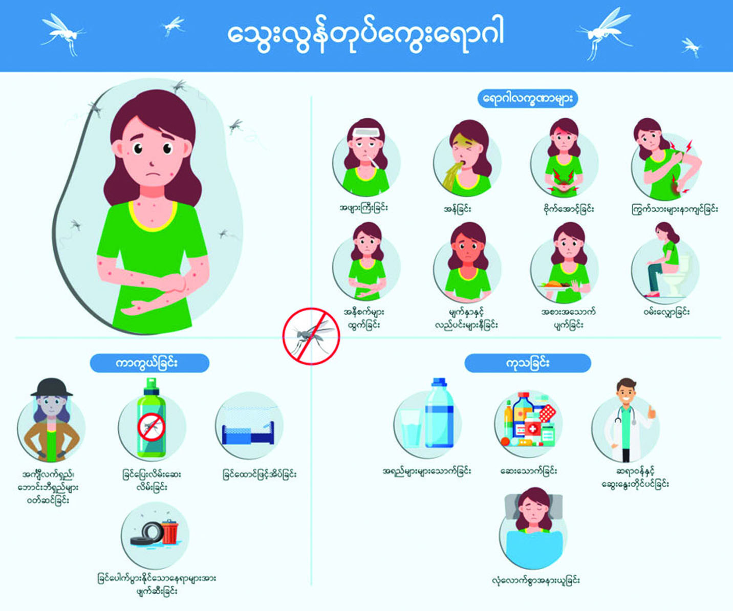 ယနေ့ မြန်မာနိုင်ငံရာသီဥတုသည် စွတ်စိုသော မိုးရာသီသို့ရောက်ရှိလာပြီဖြစ်ရာ မိုးရာသီကာလတွင် ဖြစ်လေ့ ရှိသော သွေးလွန်တုပ်ကွေး၊ ရာသီတုပ်ကွေး၊ ဝမ်းပျက်ဝမ်းလျှော၊ အရေပြားရောဂါ စသည့် ကူးစက်တတ်သော ရောဂါအမျိုးမျိုးတို့အပြင် ကိုဗစ်-၁၉ ဗိုင်းရပ်စ်ပိုးများကိုလည်း အစဉ်သတိရှိကြစေလိုပါသည်။ မိုးရာသီကာလ ဖြစ်လေ့ဖြစ်ထရှိသော ရောဂါများသည် အထိုက်အလျောက် ကြိုတင်ကာကွယ်နိုင်သည့် ရောဂါများဖြစ်ကြရာ မိမိနှင့် မိသားစု တစ်စုချင်းစီအလိုက် ရောဂါမဖြစ်အောင် ကျန်းမာရေးနှင့်လျော်ညီစွာ ပြုမူနေထိုင် ကြခြင်းဖြင့် ကြိုတင်ကာကွယ်စေလိုကြောင်း ထပ်လောင်း အသိပေးလိုက်ရပါသည်။