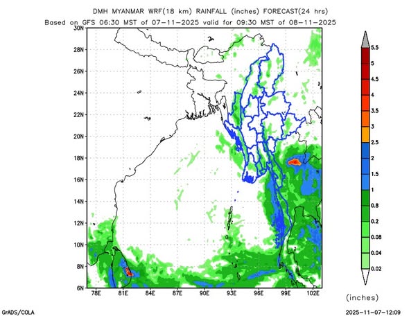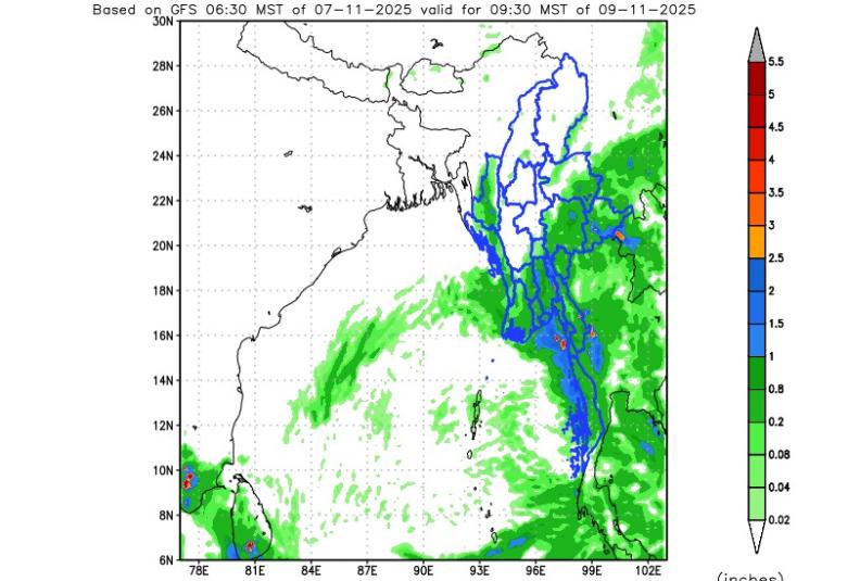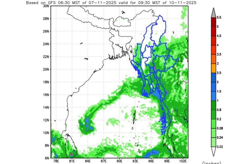 Nov 7,2025 |03:15 | ၇-၁၁-၂၀၂၅ မိုးလေဝသနှင့်ဇလဗေဒညွှန်ကြားမှုဦးစီးဌာန၊ WRF မော်ဒယ်လ်၏ ၇-၁၁-၂၀၂၅ ရက်နေ့ မြန်မာစံတော်ချိန် ၀၆:၃၀ နာရီအချိန်ကို အခြေခံတွက်ထုတ်ထားသည့် ၈-၁၁-၂၀၂၅ ရက်နေ့မှ ၁၀-၁၁-၂၀၂၅ ရက်နေ့အထိ မိုးရွာသွန်းမှုခန့်မှန်းချက်ပြပုံ Crd> မိုး/ဇလ
