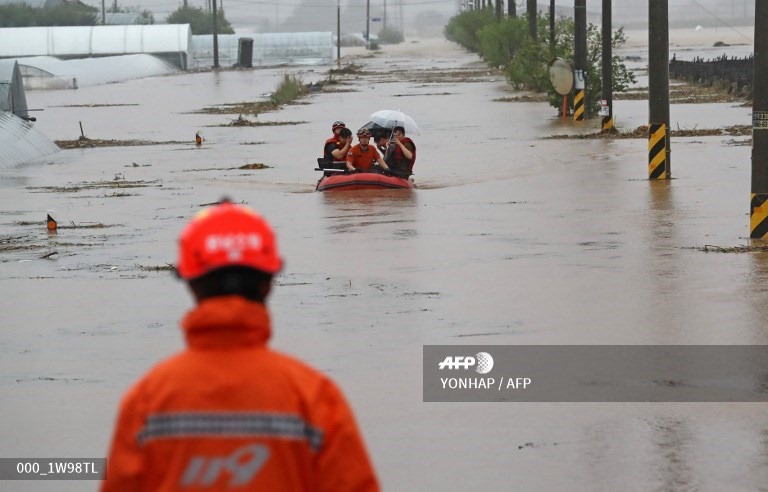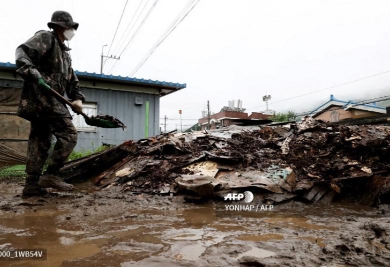 တောင်ကိုရီးယားနိုင်ငံမှာ ရက်ပေါင်း ၄၀ ကျော် ဆက်တိုက်မိုးရွာသွန်းနေတဲ့အတွက် နိုင်ငံ့အလယ်ပိုင်းမှာ ရေကြီးရေလျှံမှုကြောင့် အနည်းဆုံး ၁၆ ဦး သေဆုံးပြီး ၁၁ ဦး ပျောက်ဆုံးနေကြောင်းနဲ့ ဒေသခံ ၁,၆၀၀ ကို နေရာရွှေ့ပြောင်းထားရကြောင်း တာဝန်ရှိသူတွေက ပြောပါတယ်။