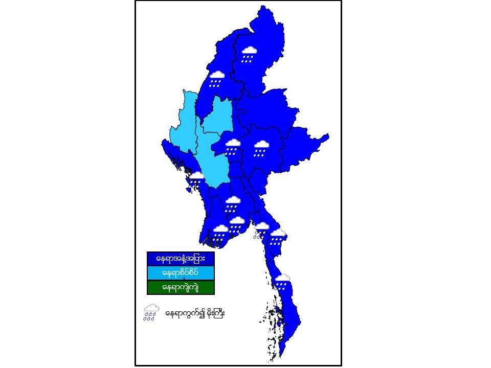မနက်ဖြန်နံနက်အထိခန့်မှန်းချက်မှာ စစ်ကိုင်းတိုင်းဒေသကြီးအောက်ပိုင်း၊ မကွေးတိုင်းဒေသကြီးနှင့် ချင်းပြည်နယ်တို့တွင် နေရာစိပ်စိပ်နှင့် ကျန်တိုင်းဒေသကြီးနှင့် ပြည်နယ်တို့တွင် နေရာအနှံ့အပြား မိုးထစ်ချုန်းရွာပြီး၊ စစ်ကိုင်းတိုင်းဒေသကြီးအထက်ပိုင်း၊ မန္တလေးတိုင်းဒေသကြီး၊ ပဲခူးတိုင်းဒေသကြီး၊ ရန်ကုန်တိုင်းဒေသကြီး၊ ဧရာဝတီတိုင်းဒေသကြီး၊ တနင်္သာရီတိုင်းဒေသကြီး၊ ကချင်ပြည်နယ်၊ ရှမ်းပြည်နယ်(တောင်ပိုင်း)၊ ရခိုင်ပြည်နယ်၊ ကရင်ပြည်နယ်နှင့် မွန်ပြည်နယ်တို့တွင် နေရာကွက်၍ မိုးကြီးနိုင်ပါသည်။ ရွာရန်ရာနှုန်းပြည့် ဖြစ်ပါသည်။