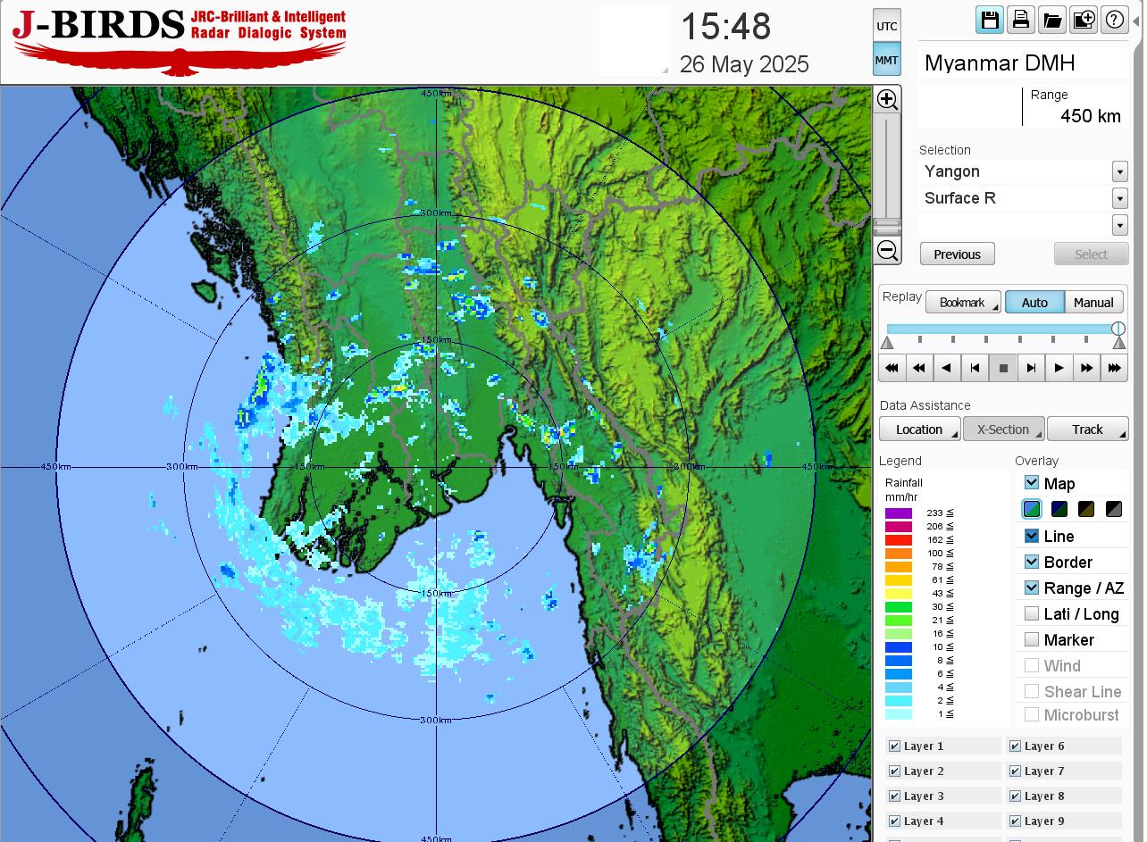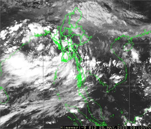 မိုးတိမ်တောင်ဖြစ်ပေါ်မှုအခြေအနေ။ နေပြည်တော်၊ ရန်ကုန်တိုင်းဒေသကြီး၊ မန္တလေးတိုင်းဒေသကြီး၊ ပဲခူးတိုင်းဒေသကြီး၊ မကွေးတိုင်းဒေသကြီး၊ ဧရာဝတီတိုင်းဒေသကြီး၊ တနင်္သာရီတိုင်းဒေသကြီး၊ ချင်းပြည်နယ်၊ ရခိုင်ပြည်နယ်၊ ကရင်ပြည်နယ်နှင့် မွန်ပြည်နယ်တို့တွင် မိုးတိမ်တောင်များ ဖြစ်ထွန်းလျက်ရှိပြီး၊ အဆိုပါ မိုးတိမ်တောင်များ ရွေ့လျားရာနေရာတစ်လျှောက်တွင် မိုးရွာသွန်းခြင်းနှင့်အတူ လေပြင်းတိုက်ခတ်ခြင်း၊ မိုးထစ်ချုန်းခြင်း၊ မိုးကြိုးပစ်ခြင်း၊ လျှပ်စီးလက်ခြင်းနှင့် မိုးသီးကြွေခြင်းစသည့် မိုးလေဝသဖြစ်စဉ်များ ဖြစ်ပေါ်နိုင်ပါသဖြင့် ကြိုတင်သတိပြုနိုင်ပါရန် အကြံပြုအပ်ပါသည်။