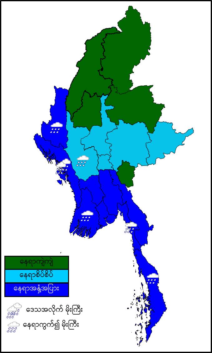 မနက်ဖြန်နံနက်အထိခန့်မှန်းချက်။ စစ်ကိုင်းတိုင်းဒေသကြီး၊ ကချင်ပြည်နယ်၊ ကယားပြည်နယ်နှင့် ရှမ်းပြည်နယ်(မြောက်ပိုင်း)တို့တွင် နေရာကျဲကျဲ၊ နေပြည်တော်၊ မန္တလေးတိုင်းဒေသကြီး၊ မကွေးတိုင်းဒေသကြီးနှင့် ရှမ်းပြည်နယ်(တောင်ပိုင်းနှင့် အရှေ့ပိုင်း)တို့တွင် နေရာစိပ်စိပ်နှင့် ကျန်တိုင်းဒေသကြီးနှင့် ပြည်နယ်တို့တွင် နေရာအနှံ့အပြား မိုးထစ်ချုန်းရွာပြီး၊ ရခိုင်ပြည်နယ်တွင် ဒေသအလိုက်နှင့် မကွေးတိုင်းဒေသကြီး၊ ဧရာဝတီတိုင်းဒေသကြီး၊ တနင်္သာရီတိုင်းဒေသကြီး၊ ချင်းပြည်နယ်နှင့် မွန်ပြည်နယ်တို့တွင် နေရာကွက်၍ မိုးကြီးနိုင်ပါသည်။ ရွာရန်ရာနှုန်းပြည့် ဖြစ်ပါသည်။