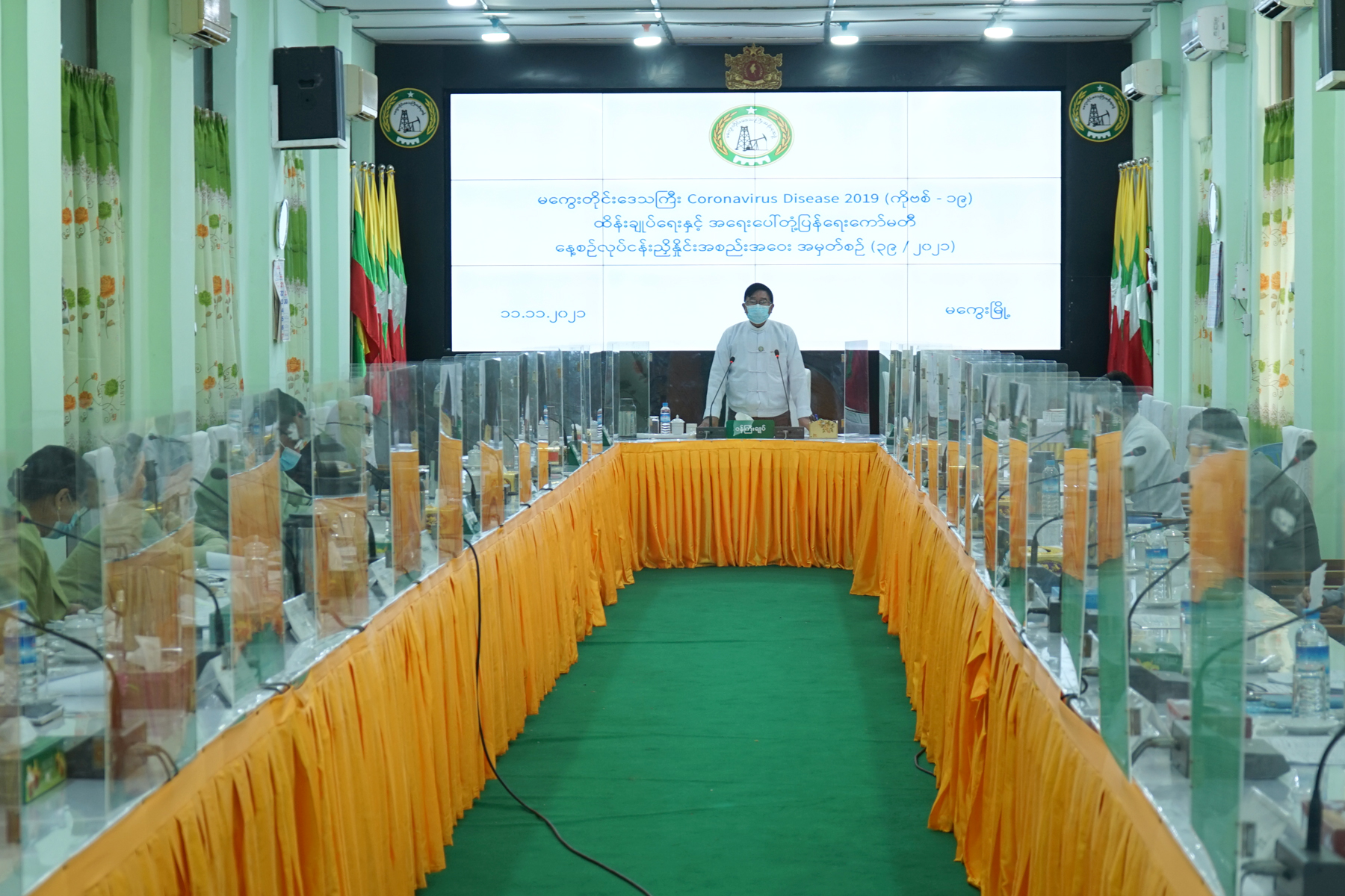 မကွေးတိုင်းဒေသကြီး ကိုဗစ်-၁၉ ရောဂါ ထိန်းချုပ်ရေးနှင့် အရေးပေါ် တုံ့ပြန်ရေးကော်မတီ နေ့စဉ်လုပ်ငန်းညှိနှိုင်း အစည်းအဝေးအမှတ်စဉ် (၃၉/၂၀၂၁) ကို ယနေ့ နံနက် ၁၀ နာရီက မကွေးတိုင်းဒေသကြီး အစိုးရအဖွဲ့ရုံး၊ အစည်းအဝေးခန်းမတွင် ကျင်းပပြုလုပ်ခဲ့ရာ တိုင်းဒေသကြီး အစိုးရအဖွဲ့ ဝန်ကြီးချုပ် ဦးတင့်လွင် တက်ရောက်ခဲ့ကြောင်း သိရသည်။