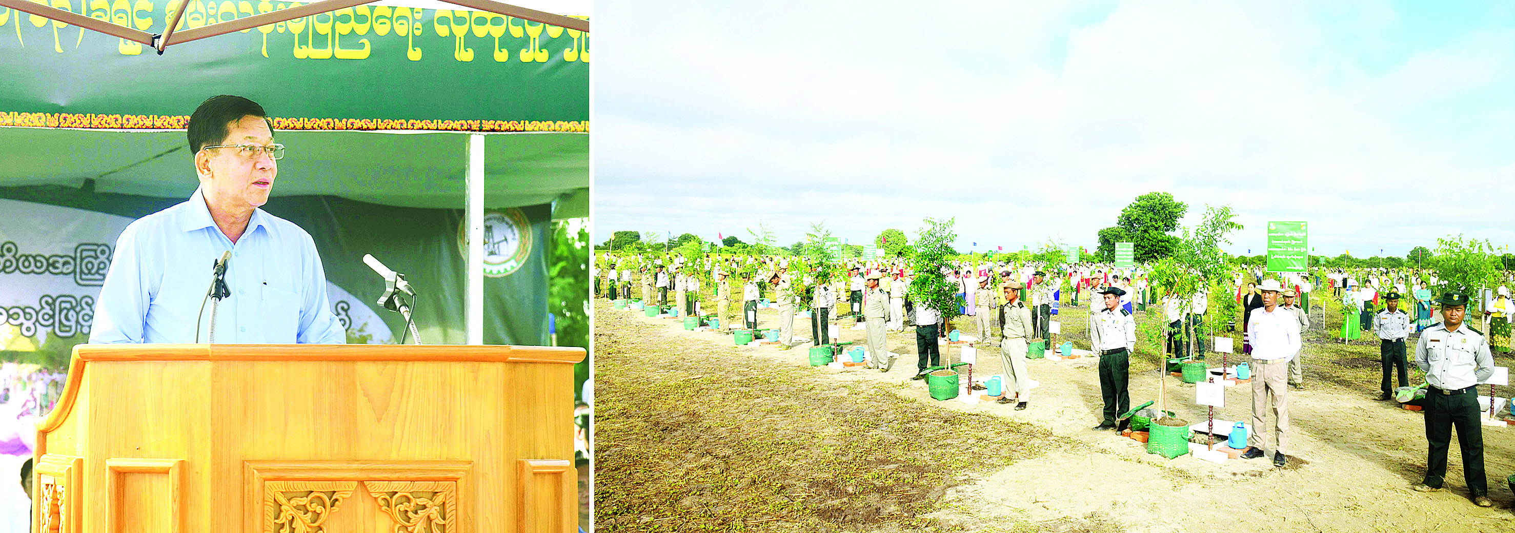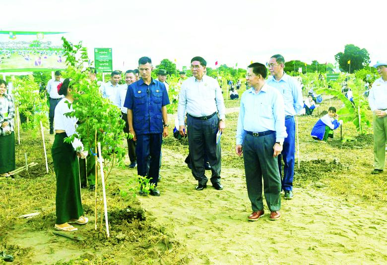 ဦးစွာ နိုင်ငံတော်လုံခြုံရေးနှင့် အေးချမ်းသာယာ ရေးကော်မရှင်ဥက္ကဋ္ဌက အပူပိုင်းဒေသ (၁၃)ခရိုင်အတွင်း ၂၀၂၅ ခုနှစ် ဒုတိယအကြိမ် မိုးရာသီလူထု လှုပ်ရှားမှုအသွင်ဖြင့် သစ်ပင်စိုက်ပျိုးပွဲတော်များ ကျင်းပရခြင်းနှင့်ပတ်သက်၍ အမှာစကား ပြောကြားရာတွင် နှစ်စဉ်မိုးရာသီကာလများတွင် သစ်ပင်စိုက်ပျိုးပွဲများကို မိမိကိုယ်တိုင်ဦးဆောင်၍ သစ်ပင် များစိုက်ပျိုးခြင်းကို ဆောင်ရွက်ပေးလျက်ရှိကြောင်း၊ အထူးသဖြင့် အပူပိုင်းဒေသများတွင် ရာသီဥတုပိုမို ပူပြင်းလာသည်ကို သတိပြုမိသည့်အတွက် သစ်ပင် များစိုက်ပျိုးခြင်းကို ဒုတိယအကြိမ်ဆောင်ရွက်ခြင်း ဖြစ်ကြောင်း၊ ဇူလိုင်လ ၁၁ ရက်နေ့ကလည်း မိတ္ထီလာ ခရိုင်တွင် မိမိကိုယ်တိုင်ဦးဆောင်၍ ပထမအကြိမ် သစ်ပင်စိုက်ပျိုးပွဲကို ကျင်းပပြုလုပ်ခဲ့ကြောင်း၊ အပူပိုင်းဒေသ ၁၃ ခရိုင်၊ မြို့နယ် ၂၉ မြို့နယ်တွင်လည်း သစ်ပင်စိုက်ပွဲတော်များကို တစ်ပြိုင်တည်း ကျင်းပဆောင်ရွက်ပေးခဲ့ပြီး သစ်ပင်စုစုပေါင်း ၃၅၀၀၀ ခန့်ကို စိုက်ပျိုး နိုင်ခဲ့ကြောင်း။