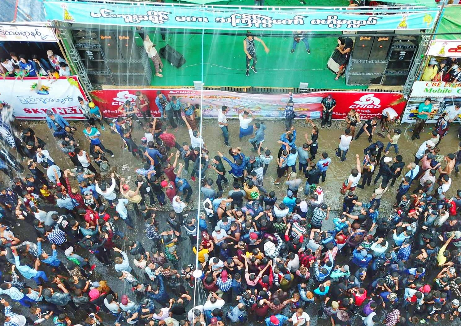 မကွေးတိုင်းဒေသကြီး၊ မင်းဘူးမြို့ မြန်မာ့ရိုးရာအတာသင်္ကြန်ပွဲတော် အတက်နေ့၌ ဗဟိုရေကစားမဏ္ဍပ်တွင် အေးချမ်းသာယာစွာ ရေကစားကြသူများ၊ စတုဒိတာ ကုသိုလ်ပြုသူများဖြင့် စည်ကား