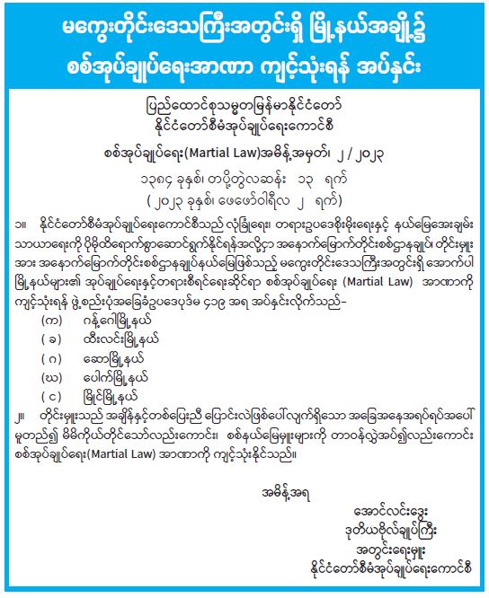 ၁။ နိုင်ငံတော်စီမံအုပ်ချုပ်ရေးကောင်စီသည် လုံခြုံရေး၊ တရားဥပဒေစိုးမိုးရေးနှင့် နယ်မြေအေးချမ်း သာယာရေးကို ပိုမိုထိရောက်စွာဆောင်ရွက်နိုင်ရန်အလို့ငှာ အနောက်မြောက်တိုင်းစစ်ဌာနချုပ်၊ တိုင်းမှူး အား အနောက်မြောက်တိုင်းစစ်ဌာနချုပ်နယ်မြေဖြစ်သည့် မကွေးတိုင်းဒေသကြီးအတွင်းရှိ အောက်ပါ မြို့နယ်များ၏ အုပ်ချုပ်ရေးနှင့်တရားစီရင်ရေးဆိုင်ရာ စစ်အုပ်ချုပ်ရေး (Martial Law) အာဏာကို ကျင့်သုံးရန် ဖွဲ့စည်းပုံအခြေခံဥပဒေပုဒ်မ ၄၁၉ အရ အပ်နှင်းလိုက်သည်-