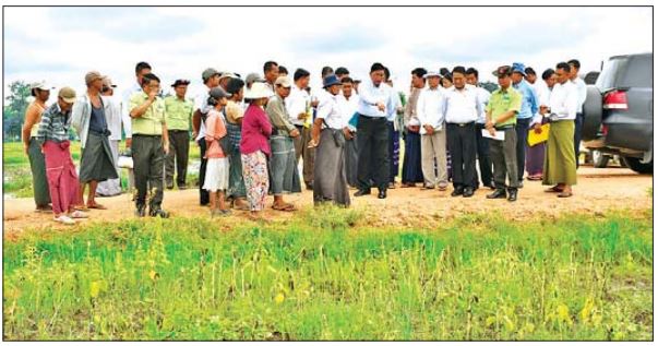 မကွေးတိုင်းဒေသကြီး မင်းဘူး(စကု)မြို့နယ်၌ မိုးများ အဆက်မပြတ်ရွာသွန်းပြီး ဒေသခံတောင်သူ များ၏ သီးနှံစိုက်ခင်းများအတွင်း မိုးရေဝင်ရောက်မှုများကြောင့် နွေနှမ်းနှင့် မိုးနှမ်းသီးနှံ စိုက်ခင်းများ ထိခိုက် ပျက်စီးမှုအခြေအနေများကို မကွေးတိုင်းဒေသကြီး ဝန်ကြီးချုပ် ဦးတင့်လွင်နှင့် တာဝန်ရှိသူများ က ဇွန် ၁၄ ရက်က သွားရောက်ကွင်းဆင်း ကြည့်ရှုစစ်ဆေးသည်။ (ယာပုံ)