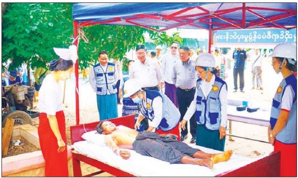 ဆက်လက်၍ သရုပ်ပြလေ့ကျင့်နေမှုများ ဆောင်ရွက်ရာတိုင်းဒေသကြီးသဘာဝဘေးအန္တရာယ် ဆိုင်ရာ စီမံခန့်ခွဲမှုအဖွဲ့၏ ဦးဆောင်မှုနှင့်အတူ မီးသတ်တပ်ဖွဲ့ဝင်များ၊ ဘေးအန္တရာယ်ဆိုင်ရာစီမံခန့်ခွဲ မှုဦးစီးဌာနမှ တာဝန်ရှိသူနှင့် ဝန်ထမ်းများ၊ ပူးပေါင်းအဖွဲ့များဖြစ်သော လုပ်ငန်းအဖွဲ့အသီးသီးနှင့် အဖွဲ့အစည်းများက သဘာဝဘေးအန္တရာယ်ဖြစ်ပေါ်လာပါက လိုက်လံသတိပေးနှိုးဆော်ခြင်း၊ အရေးပေါ်ရှာဖွေ ကယ်ဆယ်ရေးလုပ်ငန်းများကို အချိန်နှင့်တစ်ပြေးညီ ဆောင်ရွက်နိုင်ရန် ကြိုတင် သရုပ်ပြလေ့ကျင့်ခြင်း၊ အရေးပေါ်ရှာဖွေကယ်ဆယ်ရေး အထောက်အကူပြု ပစ္စည်းများဖြင့် သဘာဝ ဘေးအန္တရာယ်များ ကြုံတွေ့ရသည့် ရွာသူ၊ ရွာသားများအား ရှာဖွေကယ်ဆယ်ခြင်း၊ ကျေးရွာရှိ ထိခိုက်လွယ်သော သက်ကြီးရွယ်အိုများ၊ မသန်စွမ်းသူများ၊ ကိုယ်ဝန်ဆောင်မိခင်များနှင့် ကလေးသူငယ်များကို ကလေးသူငယ်များကိုသယ်ယူပို့ဆောင်ရေးယာဉ်မျာ သယ်ယူပို့ဆောင်ရေး ယာဉ်များဖြင့် ဘေးလွတ်ရာသို့ ရွှေ့ပြောင်းခြင်း၊ လှေတိမ်းမှောက်ပြီး ရေနစ်သူနှစ်ဦးအား ကြက်ခြေနီ အဖွဲ့က ရှေးဦးသူနာပြုစုခြင်းဖြင့် အသက်ကယ်ဆောင်ရွက်ပြီး လူနာနှစ်ဦးအား ပိုမိုစိတ်ချရသည့် ဆေးရုံသို့ ပို့ဆောင်ခြင်းများ၊ အသက်ကယ်အင်္ကျီဝတ်ဆင်ပုံ နည်းများ၊ သဘာဝဘေးဒဏ်ခံရသည့် လူနာများအား ရှေးဦးသူနာပြုစုနည်းများဖြင့် ကုသခြင်း၊ မြစ်ရေ ကြီးမြင့်လာပါက နီးစပ်ရာအရေးပေါ် စခန်းများသို့ ရွှေ့ပြောင်းရန် သရုပ်ပြလေ့ကျင့်ခြင်းတို့ကို ဆောင်ရွက်ရာ တိုင်းဒေသကြီးဝန်ကြီးချုပ်နှင့် တာဝန်ရှိသူများက ကြည့်ရှုအားပေးကာ ကျေးရွာသူ ကျေးရွာသားများအား အချိုရည်၊ မုန့်၊ စားသောက်ဖွယ်ရာများနှင့် သောက်ရေသန့်များ ဝေငှပေးခဲ့ကြောင်း သိရသည်။