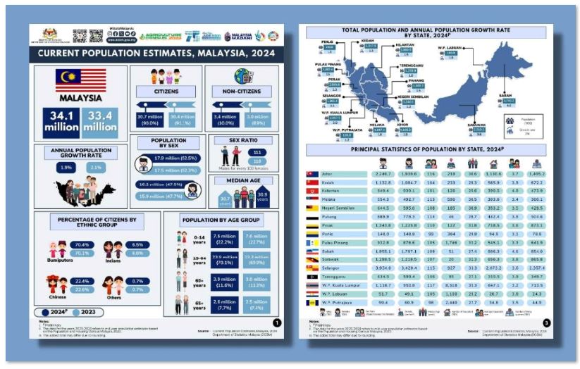မလေးရှားနိုင်ငံ၏လူဦးရေစုစုပေါင်းသည် ယခုနှစ် ဒုတိယသုံးလတာကာလတွင် ၃၄ ဒသမ ၁ သန်းရှိရာ လွန်ခဲ့သောနှစ်က လူဦးရေ ၃၃ ဒသမ ၄ သန်းနှင့်နှိုင်းယှဉ်ပါက မြင့်တက်လာကြောင်း ယမန်နေ့ကတရားဝင်အချက်အလက်ဖော်ပြထားသည်။