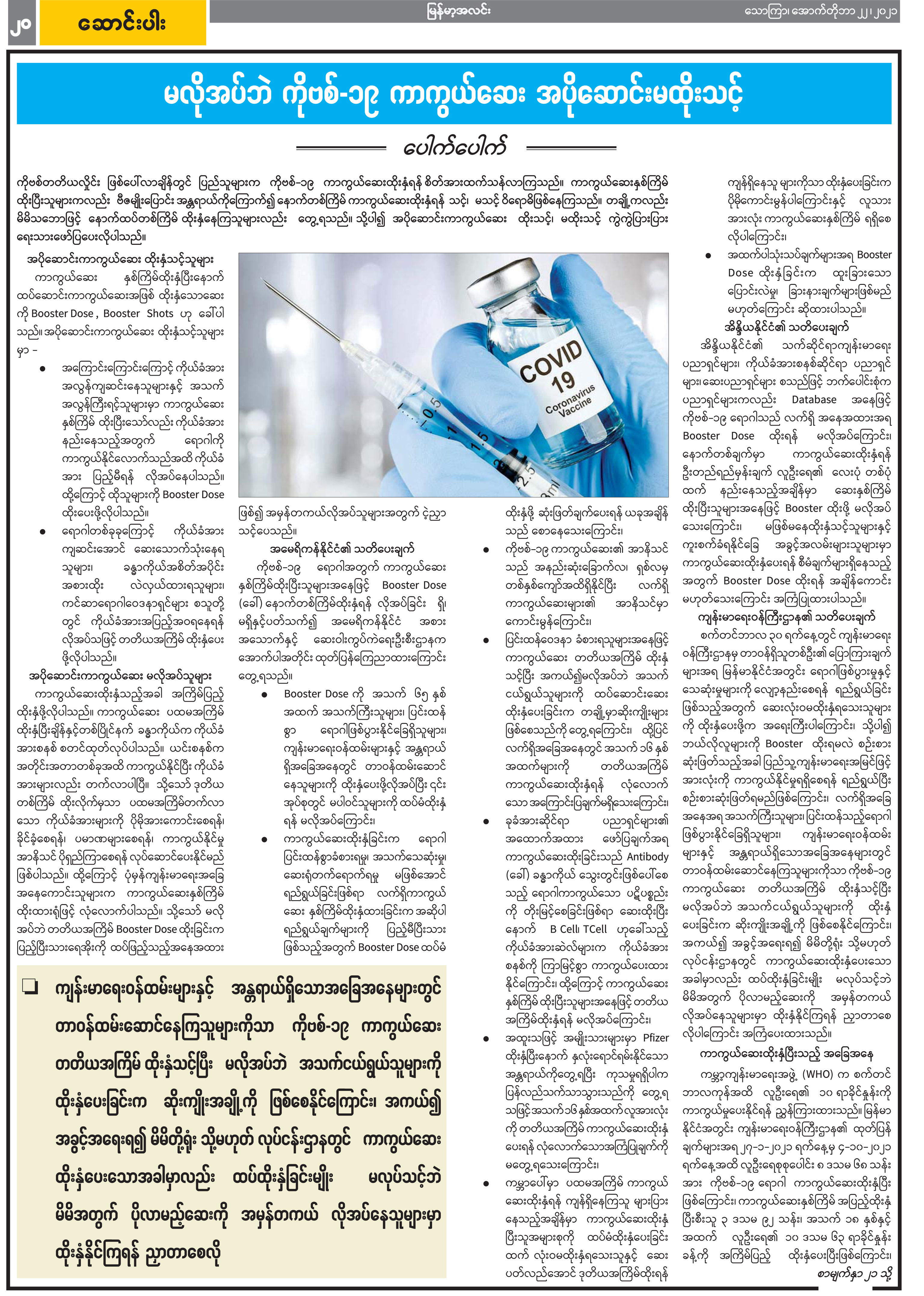 မလိုအပ်ဘဲ ကိုဗစ်-၁၉ ကာကွယ်ဆေး အပိုဆောင်းမထိုးသင့်