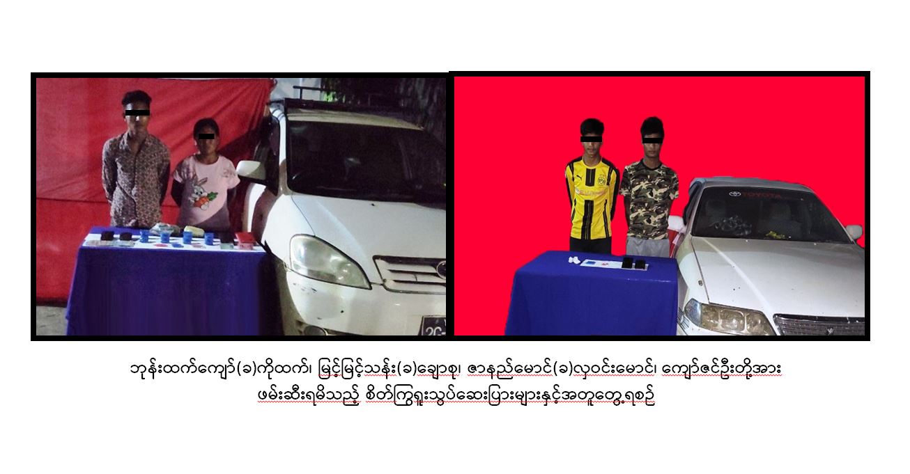 မူးယစ်ဆေးဝါး တားဆီးနှိမ်နင်းရေးရဲတပ်ဖွဲ့မှ တပ်ဖွဲ့ဝင်များသည် စက်တင်ဘာ ၁၂ ရက် ညပိုင်းတွင် မံစီမြို့နယ်၊ မံသာကျေးရွာအနီး၊ မံသာ-သံတံတားကျေးရွာသွား ကားလမ်းတွင် ဘုန်းထက်ကျော်(ခ)ကိုထက် မောင်းနှင်ပြီး မမြင့်မြင့်သန်း (ခ)ချောစု လိုက်ပါလာသည့် IPSUM အမျိုးအစား မော်တော်ယာဉ်နှင့် အဆိုပါယာဉ်မှ ကြိုးဖြင့်ဆွဲလာသည့် ဇာနည်မောင်(ခ) လှဝင်းမောင်နှင့် ကျော်ဇင်ဦးတို့လိုက်ပါလာသော Mark-II အမျိုးအစား မော်တော်ယာဉ်တို့အား စစ်ဆေးရှာဖွေရာ စိတ်ကြွရူးသွပ်ဆေးပြား ၁,၇၄၅ ပြားနှင့် မြန်မာငွေကျပ် ၂၂၀,၀၀၀ တို့ကိုလည်းကောင်း။