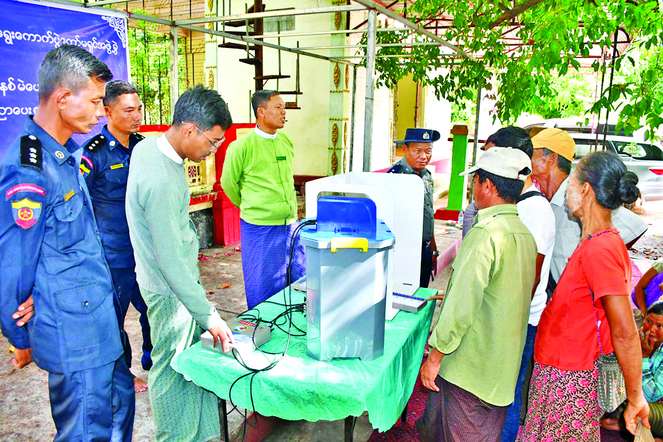 ဆက်လက်၍ အခမ်းအနား တက်ရောက်လာသူများက မြန်မာ အီလက်ထရောနစ် မဲပေးစက်ဖြင့် လက်တွေ့သရုပ်ပြ စမ်းသပ်မဲပေး ခြင်းလုပ်ငန်းများ ဆောင်ရွက်ခဲ့ကြောင်း သိရသည်။