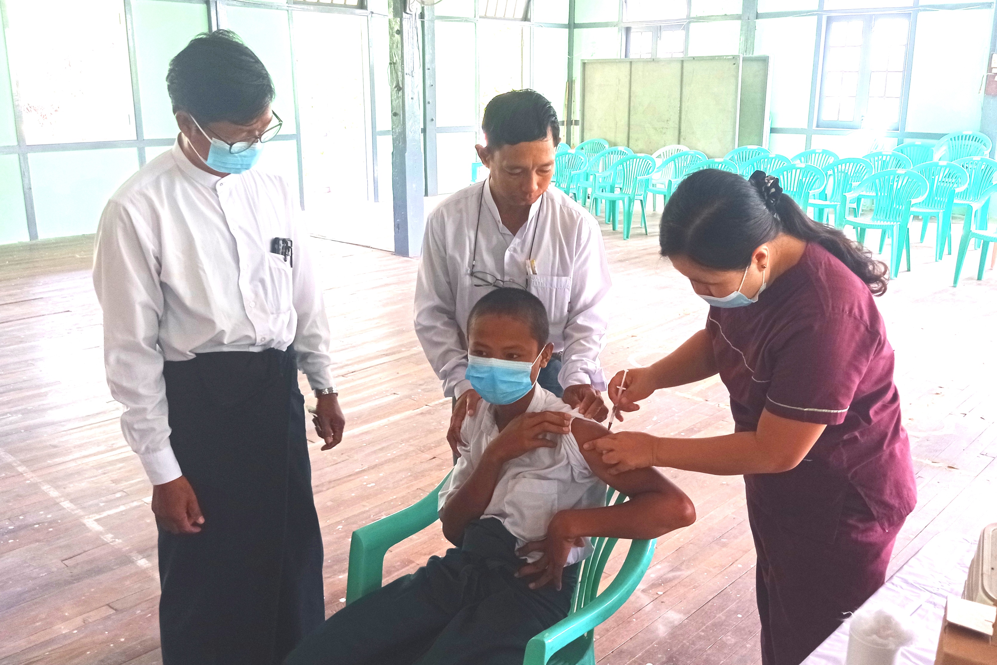 ထိုသို့ ထိုးနှံပေးရာတွင် မူ(လွန်) ကျောင်း (၁၈) ကျောင်း၊ အလက (ခွဲ) (၁၀) ကျောင်း၊ အလက (၂၆) ကျောင်း၊ အထက (ခွဲ) (၂၅) ကျောင်း၊ အထက (၉) ကျောင်းဖြစ်၍ ကျောင်းပေါင်း (၈၈) ကျောင်းမှ ကျောင်းသား ကျောင်းသူ (၂၀၀၀၀) ခန့်အား ထပ်ဆောင်း ကာကွယ်ဆေး Booster Dose ထိုးနှံပေးလျက်ရှိပြီး ဆေးမထိုးမီ ကျန်းမာရေးဝန်ထမ်း များက ကိုယ်အပူချိန် တိုင်းတာခြင်း၊ သွေးပေါင်ချိန် တိုင်းတာပေးခြင်း၊ အောက်ဆီဂျင် အနည်းအများ တိုင်းတာခြင်းစသော ကျန်းမာရေး စစ်ဆေးမှုများ ဆောင်ရွက်လျက်ရှိကြောင်း သိရသည်။