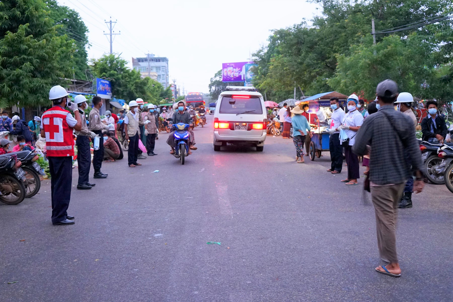 ထိုသို့ဆောင်ရွက်ရာတွင် ခရိုင်၊ မြို့နယ် ကြက်ခြေနီတပ်ဖွဲ့ဝင်များနှင့် ချမ်းသာကြီး ပရဟိတ လူမှုကူညီရေး (မင်းဘူး) တို့ ပူးပေါင်းပြီး မင်းဘူးမြို့ တမာတန်းလမ်းရှိ ယာယီ နံနက်ခင်းဈေးအဖြစ် လက်လီလက်ကား ရောင်းဝယ်ဖောက်ကားနေကြသော ဈေးရောင်း ဈေးဝယ်များနှင့် လမ်းသွားလမ်းလာ မိဘပြည်သူများအား အလှူရှင်များမှ လှူဒါန်းသော နှာခေါင်းစည်း (Mask) အခုရေ ၂၀၀၀ ကို အခဲ့မဲ့ဖြန့်ဝေပေးခဲ့ကြခြင်း ဖြစ်သည်။