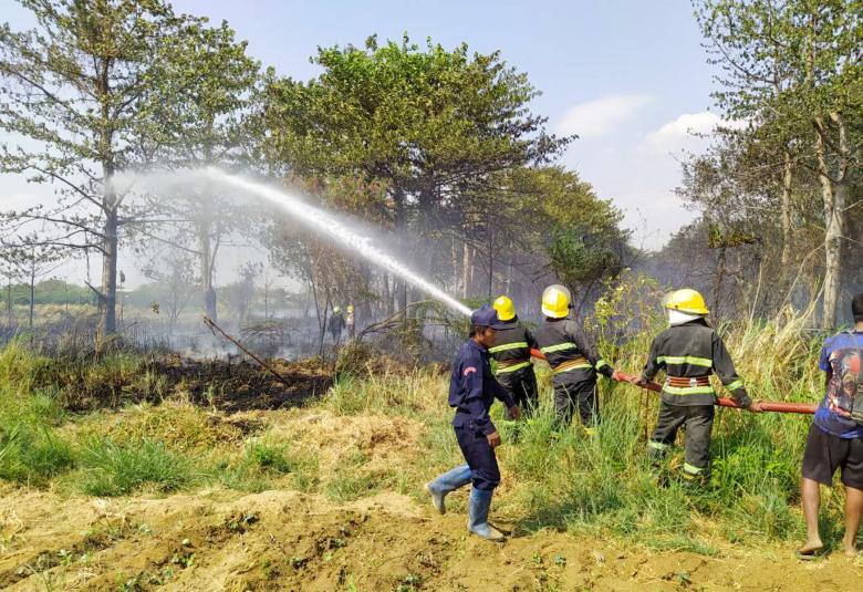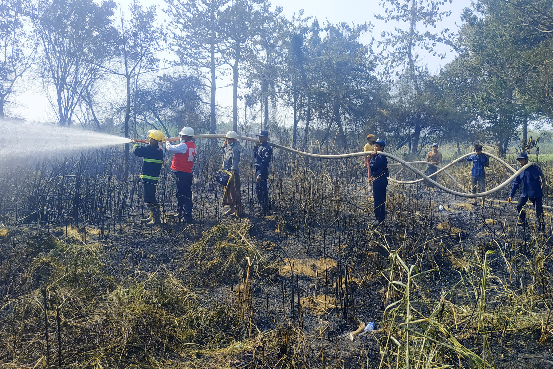 ဖြစ်စဉ်မှာ မင်းဘူးမြို့နယ် မီးသတ်စခန်း၏ တောင်ဘက် ၅ မိုင်ခန့်အကွာ မင်းဘူးမြို့ရှိ ထောက်ရှာပင် ကမ်းနီရေနံမြေအမှတ်(၁)၊ ကျောက်တန်း ရေတင်စက်အနီးတွင် တောမီးလောင်ကျွမ်းမှု ဖြစ်ပွားခဲ့ကြောင်း သိရှိရသဖြင့် မီးလောင်ရာနေရာသို့ မြို့နယ် မီးသတ်ဦးစီးမှူး ဦးစိန်ထွန်းဦးဆောင်၍ သန္ဓေမီးသတ်တပ်ဖွဲ့ဝင် ၁၇ ဦး၊ မီးငြှိမ်းသတ်ယာဉ် ၂ စီး၊ မီးသတ်ရေ သယ်ယာဉ် ၁ စီး၊ ထောက်ရှာပင်နယ်မြေ မီးသတ်စခန်းမှ လက်ထောက် မီးသတ် ဦးစီးမှူး ဦးနိုင်လင်းဖြိုး ဦးဆောင်၍ သန္ဓေမီးသတ်တပ်ဖွဲ့ဝင် ၉ ဦး၊ အရန်မီးသတ် တပ်ဖွဲ့ဝင် ၅ ဦး၊ မီးငြှိမ်းသတ်ယာဉ် ၁ စီး၊ မီးသတ်ရေသယ်ယာဉ် ၁ စီး၊ ထောက်ရှာပင် ကမ်းနီရေနံမြေမှ သီးသန့် မီးသတ်တပ်ဖွဲ့ဝင် ၅ ဦး၊ မီးငြှိမ်းသတ်ယာဉ် ၁ စီး၊ မီးသတ်ရေသယ် ယာဉ် ၁ စီး၊ စုစုပေါင်း သန္ဓေမီးသတ်တပ်ဖွဲ့ဝင် ၂၆ ဦး၊ အရန်မီးသတ်တပ်ဖွဲ့ဝင် ၅ ဦး၊ သီးသန့် မီးသတ်တပ်ဖွဲ့ဝင် ၅ ဦး၊ မီးသတ်ယာဉ် ၇ စီးဖြင့် ဝိုင်းဝန်းမီးငြှိမ်းသတ်ခဲ့ရာ ၅ နာရီနှင့် ၁၀မိနစ် အချိန်တွင် မီးထိန်းနိုင် ခဲ့ပြီး ၅ နာရီခွဲ အချိန်၌ ရေဂါလံ ၈၀၀၀ ခန့်ဖြင့် မီးငြှိမ်းသတ်နိုင်ခဲ့သည်။