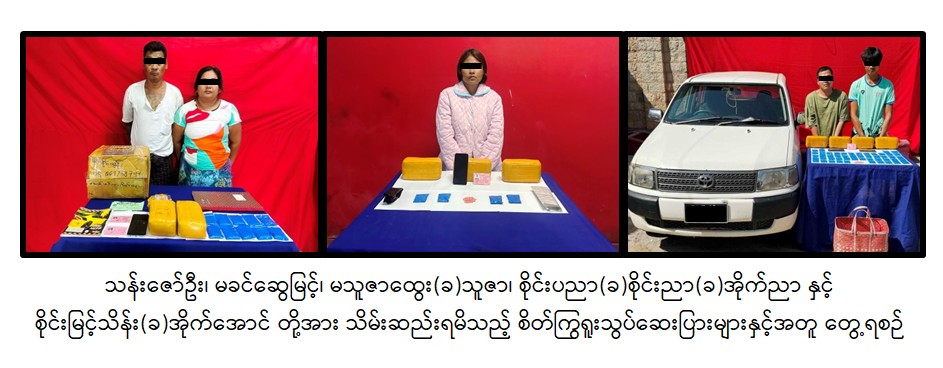 မူးယစ်ဆေးဝါးတားဆီးနှိမ်နင်းရေးရဲတပ်ဖွဲ့မှ တပ်ဖွဲ့ဝင်များပါဝင်သော ပူးပေါင်းအဖွဲ့သည် ဖေဖော်ဝါရီ ၂၄ ရက် နံနက် ၉နာရီခွဲတွင် မင်္ဂလာဒုံမြို့နယ်၊ ချစ်တီးကုန်းရပ်ကွက်၊ အောင်မင်္ဂလာ အဝေးပြေးကားဝင်းရှိ ကားဂိတ်တွင် ပါဆယ်ပစ္စည်းလာရောက်ထုတ်ယူသူ မခင်ဆွေမြင့်အား စစ်ဆေး ရှာဖွေရာ စိတ်ကြွရူးသွပ်ဆေးပြား ၂၀,၀၀၀  (တစ်ပြားလျှင် ၁,၀၀၀ ကျပ်နှုန်းဖြင့် ၎င်းဒေသတန်ဖိုးငွေ သိန်း ၂၀၀ )သိမ်းဆည်းရမိခဲ့ပြီး ကွင်းဆက်အရ ဖေ‌ဖော်ဝါရီ ၂၄ ရက် ညနေ ၆နာရီခွဲတွင် စိတ်ကြွရူးသွပ်ဆေးပြားများ ပို့ဆောင်ပေးသူ မသူဇာထွေး (ခ)သူဇာကို ကလောမြို့နယ်၊ ဟဲဟိုးကျေးရွာအုပ်စု၊ ဝါးရုံပင်ကျေးရွာတွင် စိတ်ကြွရူးသွပ်ဆေးပြား ၃၀,၈၀၀ (တစ်ပြားလျှင် ၅၀၀ ကျပ်နှုန်းဖြင့် ၎င်းဒေသတန်ဖိုးငွေ ၁၅၄ သိန်း) ၊ ဖေဖော်ဝါရီ ၂၅ ရက် နံနက် ၆နာရီ အချိန် စိတ်ကြွရူးသွပ်ဆေးပြားများ သယ်ဆောင်ရောင်းဝယ်ရာ၌ ပူးပေါင်းပါဝင်သူ သန်းဇော်ဦးကို သန်လျင်မြို့၊ မြို့ဟောင်း(အနောက်)ရပ်ကွက်တွင် လည်းကောင်း၊ ဖေဖော်ဝါရီ ၂၆ ရက် မွန်းလွဲပိုင်း ၁နာရီခွဲတွင် စိတ်ကြွရူးသွပ်ဆေးပြားများ ရောင်းချပေးသူ စိုင်းပညာ(ခ) စိုင်းညာ(ခ)အိုက်ညာနှင့် စိုင်းမြင့်သိန်း(ခ)အိုက်အောင်တို့ကို တောင်ကြီးမြို့၊ စပ်စံထွန်းရပ်ကွက်တွင် စိတ်ကြွရူးသွပ်ဆေးပြား ၅၀,၀၀၀ (တစ်ပြားလျှင် ၅၀၀ ကျပ်နှုန်းဖြင့် ၎င်းဒေသတန်ဖိုးငွေ ငွေကျပ် သိန်း ၂၅၀ )၊ PROBOX မော်တော်ယာဉ်တစ်စီးနှင့်လည်းကောင်း ၊ ဖေဖော်ဝါရီ ၂၆ ရက် ညနေ ၇နာရီခွဲတွင်   နမ့်စန်မြို့၊ အမှတ်(၅)ရပ်ကွက်၊ နမ့်စန်-မိုးနဲသွားကားလမ်းတွင် ခွန်မောင်လံ(ခ) လုံးလံ မောင်းနှင်လာသည့် NISSAN MARCH အမျိုးအစား မော်တော်ယာဉ်ကို ရပ်တန့်စစ်ဆေး ရှာဖွေရာ စိတ်ကြွရူးသွပ်ဆေးပြား ၅,၀၀၀  (တစ်ပြား လျှင် ၅၀၀ ကျပ်နှုန်းဖြင့် ၎င်းဒေသတန်ဖိုးငွေ ၂၅ သိန်း)ကိုလည်းကောင်း ဖမ်းဆီးရမိခဲ့သဖြင့် ၎င်းတို့ကို မူးယစ်ဆေးဝါးနှင့် စိတ်ကိုပြောင်းလဲစေသော ဆေးဝါးများဆိုင်ရာဥပဒေအရ အရေးယူထားကြောင်း သိရသည်။