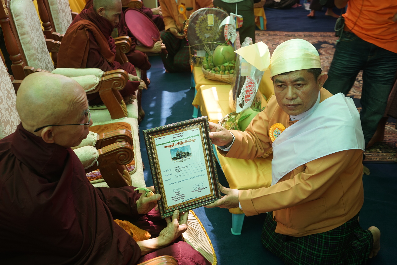 ဆက်လက်၍ မင်းလှမြို့ ဝေဠုဝန်ပရိယတ္တိစာသင်တိုက်ဦးစီးပဓာန နာယကဆရာတော် နိုင်ငံတော်သြဝါဒါစရိယ ဆရာတော်ဘုရားကြီးထံမှ ငါးပါးသီလခံယူခြင်း၊ လှူဘွယ်ပစ္စည်းများဆက်ကပ်လှူ ဒါန်းခြင်း၊သြဝါဒကထာနှင့် ရေစက်ချအနုမောဒနာ တရားနာယူကြပြီး အလှူရှင်များအား ဂုဏ်ပြုမှတ်တမ်းလွှာများကို ပဲခူးတိုင်းဒေသကြီး အစိုးရအဖွဲ့ ဝန်ကြီးချုပ်၊ လွှတ်တော်ဥက္ကဋ္ဌ၊ အစိုးရအဖွဲ့ဝန်ကြီးနှင့် လွှတ်တော်ကိုယ်စားလှယ်များက အသီးသီး ပေးအပ်ချီးမြှင့်ကြပြီးနောက် အခမ်းအနားအား ဗုဒ္ဓသာသနံစိရံတိဌတု(၃)ကြိမ်ရွတ်ဆို၍ အခမ်းအနားပြီးမြောက်ကြောင်း ကြေငြာသည်။