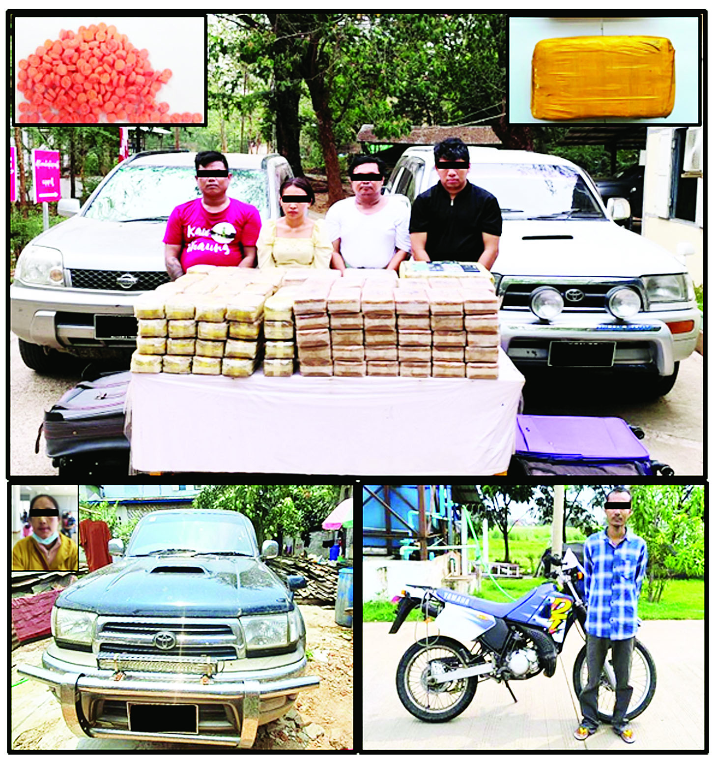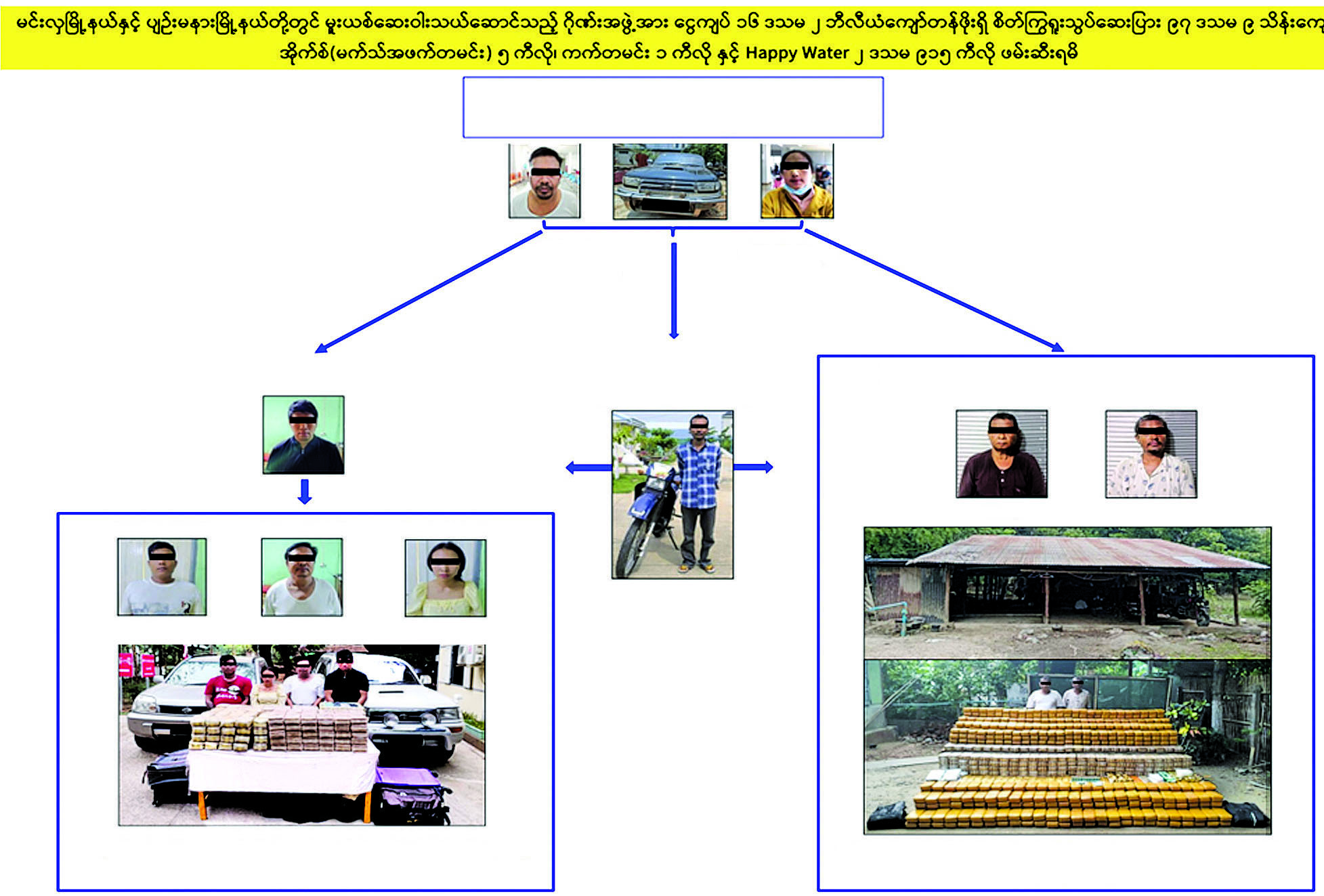 လုံခြုံရေးတပ်ဖွဲ့ဝင်များပါဝင်သော ပူးပေါင်းအဖွဲ့သည် မေလ ၉ ရက်နေ့ မွန်းလွဲ ၂ နာရီခွဲအချိန် မင်းလှမြို့နယ်၊ ပုသိမ်-မုံရွာသွားကားလမ်း၊ ရှမ်းတဲကျေးရွာအနီးတွင် သတင်းအရစောင့်ဆိုင်းနေစဉ် မင်းလှဘက်မှ မင်းတုန်းဘက်သို့ ပြည့်ဖြိုးကျော်မောင်းနှင်ပြီး မဇင်ဇင်ဝေ(ခ)ဇင်ဇင်မာ လိုက်ပါလာသည့် X-TRAIL မော်တော်ယာဉ်နှင့် ရန်နိုင်ထွဋ် မောင်းနှင်ပြီး တင်လတ်လိုက်ပါလာသည့် SURF မော်တော်ယာဉ်တို့ကိုရှာဖွေခဲ့ရာ အဆိုပါယာဉ် ၂ စီးပေါ်မှ စိတ်ကြွရူးသွပ်ဆေးပြား ၂၁ ဒသမ ၈ သိန်း ဖမ်းဆီးရမိခဲ့ပြီး ၎င်းတို့၏ ဖော်ထုတ်ချက်အရ ပျဉ်းမနားမြို့မှ မကွေးတိုင်းဒေသကြီး၊ မင်းတုန်းမြို့နယ်သို့ စိတ်ကြွရူးသွပ်ဆေးပြားများ သယ်ဆောင်ခိုင်းသူ မနန်း(ခ)မျိုးသီရိကျော်နှင့် မျိုးဇော်အောင်တို့ ၂ ဦး၏ မူးယစ်ဆေးဝါးသယ်ဆောင်ရာ၌ အသုံးပြုခဲ့သည့် TOYOTA HILUX SURF မော်တော်ယာဉ်တစ်စီးအား ပျဉ်းမနားမြို့၊ ရန်အောင်(၂)ရပ်ကွက်ရှိ ၎င်းတို့၏နေအိမ်တွင် သိမ်းဆည်းရမိခဲ့ကြောင်း၊ မျိုးဇော်အောင်နှင့် မနန်း(ခ)မျိုးသီရိကျော်တို့သည် ပျဉ်းမနားမြို့နယ်၊ မြောက်လွတ်ကုန်းကျေးရွာရှိအောင်နိုင်၏ နွားခြံစတိုအတွင်း ကရင်ပြည်နယ်သို့ပို့ဆောင်မည့် မူးယစ်ဆေးဝါးများ သိုဝှက်ထားကြောင်းသိရှိရသဖြင့် မူးယစ်ဆေးဝါးတားဆီးနှိမ်နင်းရေးရဲတပ်ဖွဲ့မှ တပ်ဖွဲ့ဝင်များပါဝင်သော ပူးပေါင်းအဖွဲ့သည် မေလ ၁၀ ရက်နေ့ ညနေ ၅ နာရီခွဲအချိန် ပျဉ်းမနားမြို့နယ်၊ မြောက်လွတ်ကုန်းကျေးရွာရှိ အောင်နိုင်၏ နွားမွေးမြူရေးခြံသို့ ဝင်ရောက်ရှာဖွေခဲ့ရာ အောင်နိုင်နှင့် ဇော်ဝင်းတို့ ၂ ဦးအား စိတ်ကြွရူးသွပ်ဆေးပြား ၇၆ ဒသမ ၁၇၈ သိန်း၊ အိုက်စ်(မက်သ်အဖက်တမင်း) ၅ ကီလို၊ ကက်တမင်း ၁ ကီလိုနှင့် စိတ်ပြောင်းဆေးဝါးများ ရောစပ်ထားသည့် Happy Water ၂ ဒသမ ၉၁၅ ကီလိုတို့နှင့်အတူ ထပ်မံဖမ်းဆီးရမိခဲ့သဖြင့် စုစုပေါင်းဒေသတန်ဖိုးငွေ ၁၆ ဒသမ ၂ ဘီလီယံတန်ဖိုးရှိ စိတ်ကြွရူးသွပ်ဆေးပြား ၉၇ ဒသမ ၉ သိန်းကျော်၊ အိုက်စ်(မက်သ်အဖက်တမင်း) ၅ ကီလို၊ ကက်တမင်း ၁ ကီလိုနှင့် စိတ်ပြောင်းဆေးဝါးများ ရောစပ်ထားသည့် Happy Water ၂ ဒသမ ၉၁၅ ကီလို ဖမ်းဆီးရမိခဲ့ကြောင်းနှင့် မေလ ၁၁ ရက်နေ့ နံနက် ၉ နာရီခွဲအချိန် စိတ်ကြွရူးသွပ်ဆေးပြားများ တင်ဆောင်ပေးသူထွန်းလင်း(ခ) ရှမ်းကုလားအား ပဲခူးတိုင်းဒေသကြီး၊ ဝေါမြို့နယ်၊ ညောင်ခါးရှည်ကျေးရွာအနီးတွင် မော်တော်ဆိုင်ကယ်တစ်စီးနှင့်အတူ ဖမ်းဆီးရမိခဲ့ကြောင်း၊ စစ်ဆေးဖော်ထုတ်ချက်များအရ မျိုးဇော်အောင်နှင့် မနန်း(ခ) မျိုးသီရိကျော်တို့သည် ရှမ်းပြည်နယ်မှ သယ်ဆောင်လာသော မူးယစ်ဆေးဝါးများကို ပျဉ်းမနားမြို့နယ်မှတစ်ဆင့် မင်းတုန်းမြို့နယ်သို့ သယ်ဆောင်ရောင်းဝယ်ရာတွင် တင်လတ်(ခ) စောတင်လတ်မှ တာဝန်ခံ၍ ပြည့်ဖြို