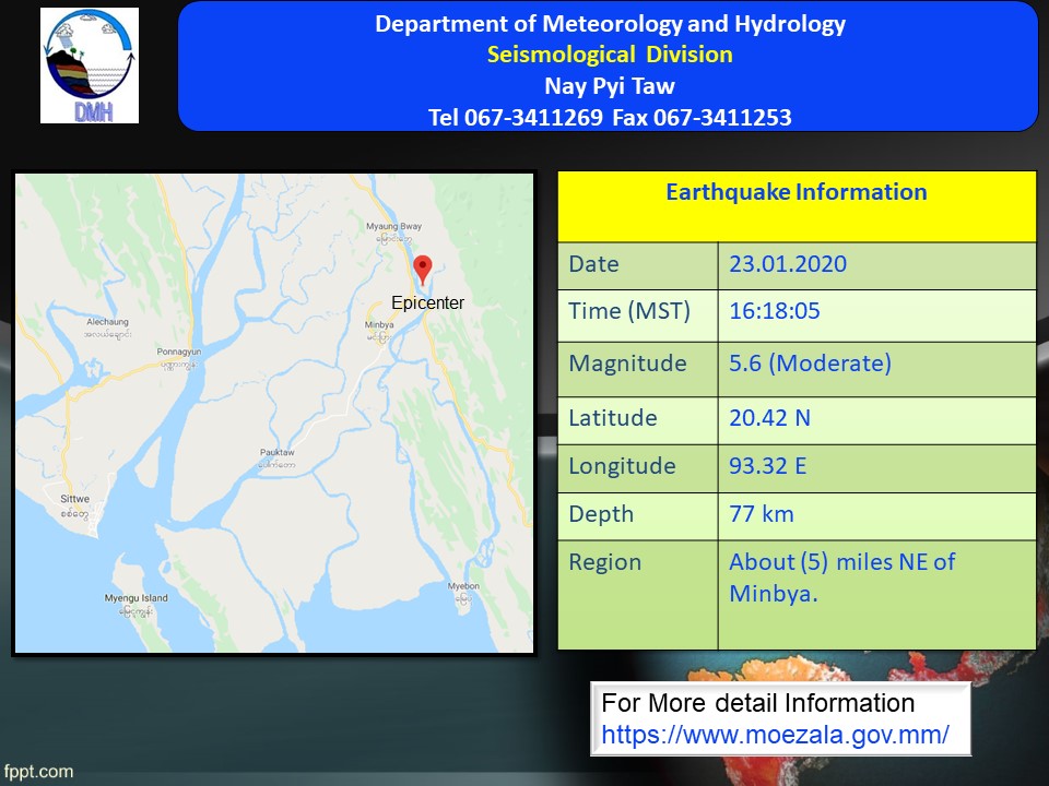 ယနေ့ မြန်မာစံတော်ချိန် ညနေ ၄ နာရီ ၁၈မိနစ်၊ ဝ၅ စက္ကန့်အချိန်တွင် စစ်တွေမြေငလျင်စခန်းမှ အရှေ့မြောက်ဘက် ၃၄ မိုင် ခန့်ကွာဝေးသော မြန်မာနိုင်ငံပြည်တွင်း (မင်းပြားမြို့၏ အရှေ့မြောက်ဘက် ၅ မိုင် ခန့်အကွာ)၊ မြောက်လတ္တီတွဒ် ၂၀ ဒသမ ၄၂ ဒီဂရီ၊ အရှေ့လောင်ဂျီတွဒ် ၉၃ ဒသမ ၃၂ ဒီဂရီ၊ အနက် ၇၇ ကီလိုမီတာကို ဗဟိုပြု၍ အင်အား ရစ်(ခ်)တာစကေး ၅ ဒသမ ၆ အဆင့်ရှိ အင်အား အသင့်အတင့်ရှိသော မြေငလျင်တစ်ခု လှုပ်ရှားသွားကြောင်း မိုးလေဝသနှင့်ဇလဗေဒညွှန်ကြားမှု ဦးစီးဌာနမှ သတင်းရရှိသည်။