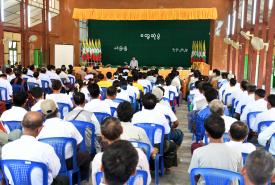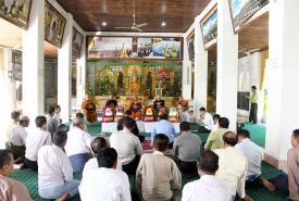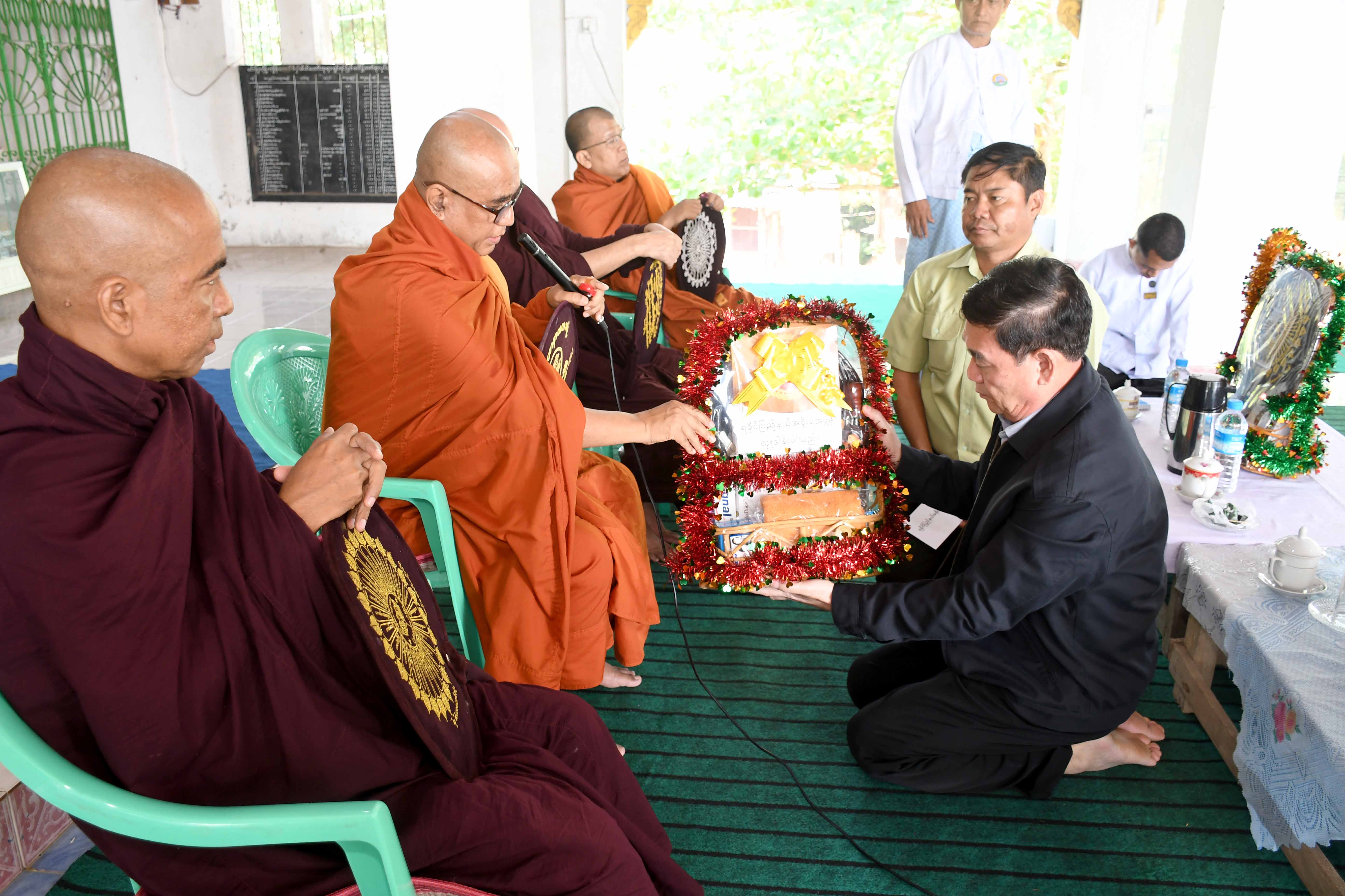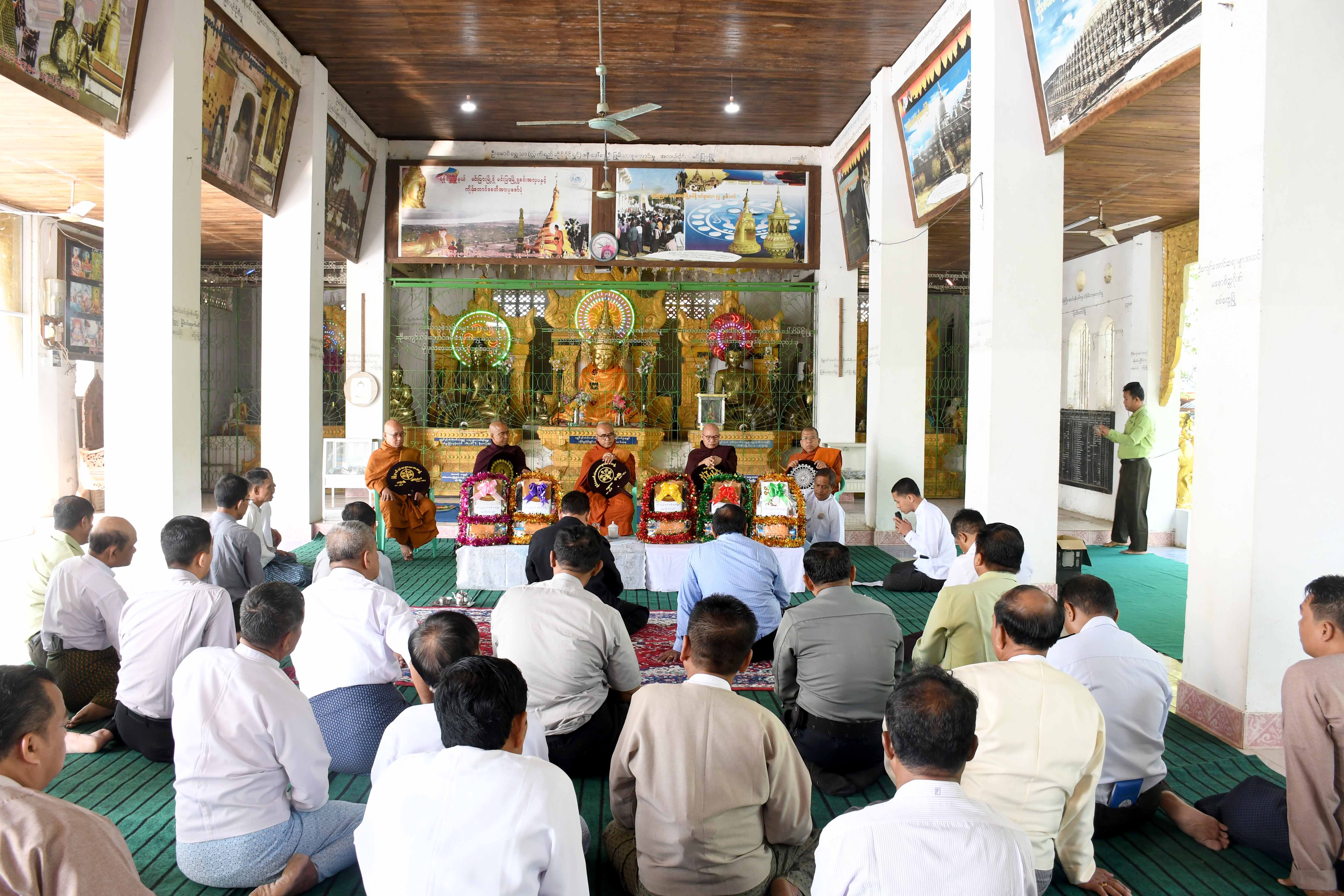 ဆက်လက်၍ ပြည်နယ်ဝန်ကြီးချုပ် အမှူးပြုသော ဧည့်ပရိသတ်များက နိုင်ငံတော် သံဃမဟာနာယကအဖွဲ့၊ တွဲဖက်အကျိုးတော်ဆောင်၊ မင်းပြားမြို့၊ ပရိယတ္တိဓမ္မိကာရုံကျောင်းတိုက်နာယက ဆရာတော် အဂ္ဂမဟာဂန္ထဝါစကပဏ္ဍိတ၊ အဂ္ဂမဟာသဒ္ဓမ္မဇောတိကဓဇ ဘဒ္ဒန္တဣန္ဒာစရိယထံမှ ငါးပါးသီလခံယူဆောက် တည်ကြပြီး လှူဖွယ်ဝတ္ထုများဆက်ကပ်လှူဒါန်းကြကာ လှူဒါန်းမှုအစုစုအတွက် ရေစက်သွန်းချ အမျှပေးဝေကြသည်။