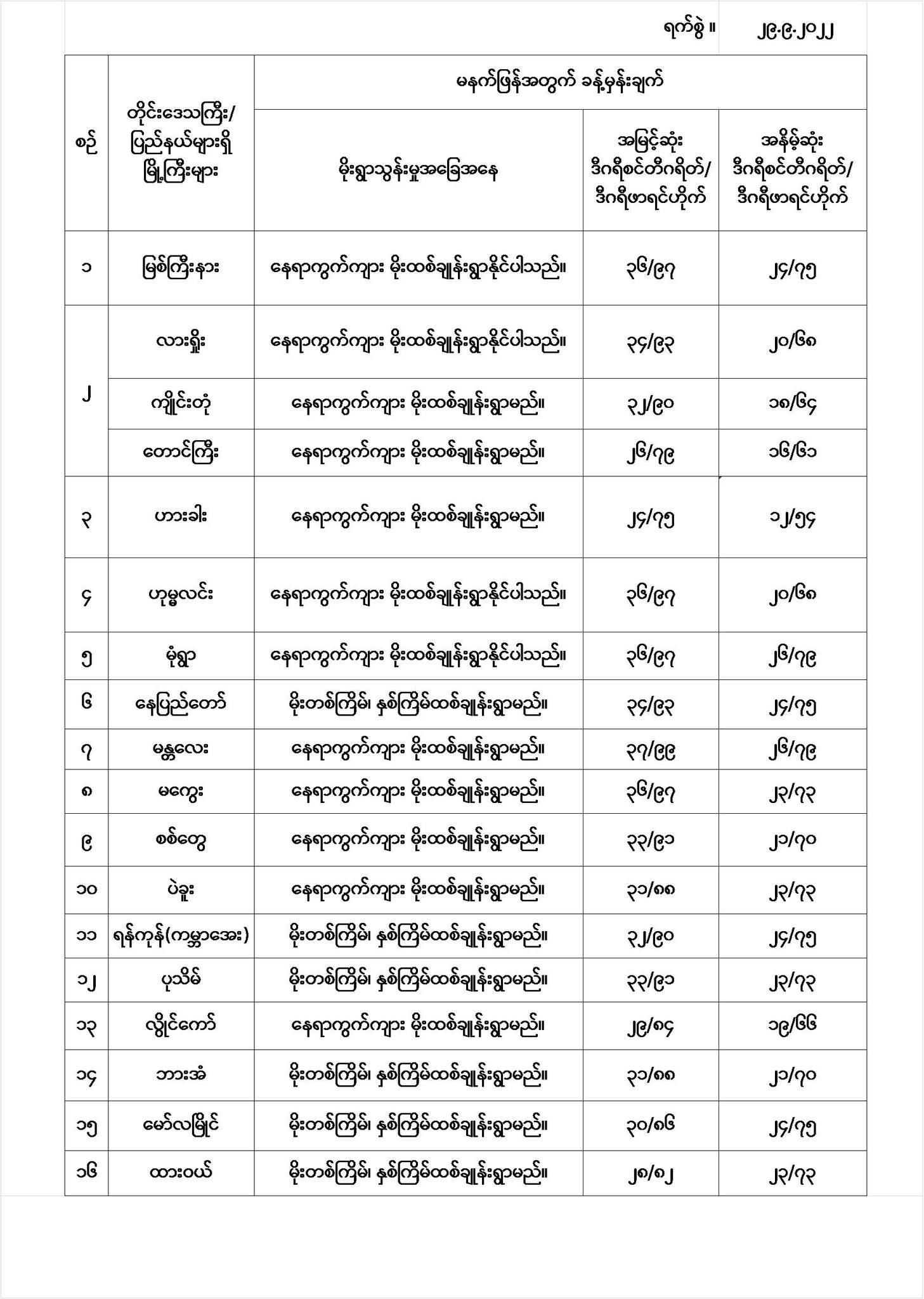 မနက်ဖြန်အတွက် တိုင်းဒေသကြီးနှင့် ပြည်နယ်များရှိ မြို့ကြီးများ၏ အမြင့်ဆုံးအပူချိန်၊ အနိမ့်ဆုံးအပူချိန်နှင့် မိုးလေဝသခန့်မှန်းချက်