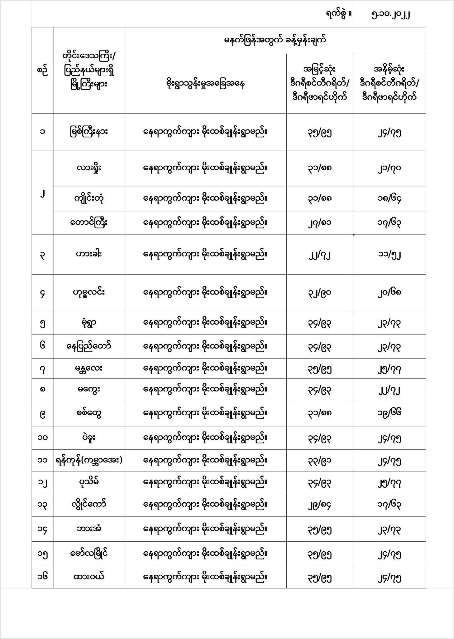မနက်ဖြန်အတွက် တိုင်းဒေသကြီးနှင့် ပြည်နယ်များရှိ မြို့ကြီးများ၏ အမြင့်ဆုံးအပူချိန်၊ အနိမ့်ဆုံးအပူချိန်နှင့် မိုးလေဝသခန့်မှန်းချက်