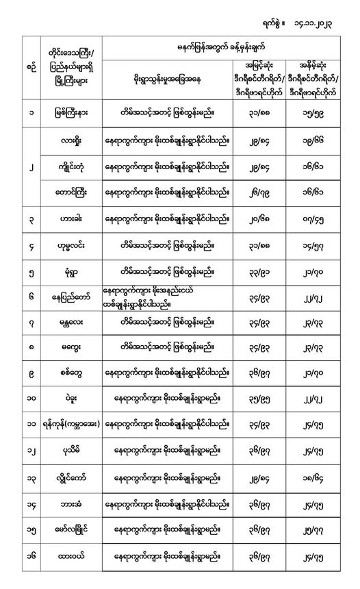 မနက်ဖြန်အတွက် တိုင်းဒေသကြီးနှင့် ပြည်နယ်များရှိ မြို့ကြီးများ၏ အမြင့်ဆုံးအပူချိန်၊ အနိမ့်ဆုံးအပူချိန်နှင့် မိုးလေဝသခန့်မှန်းချက်