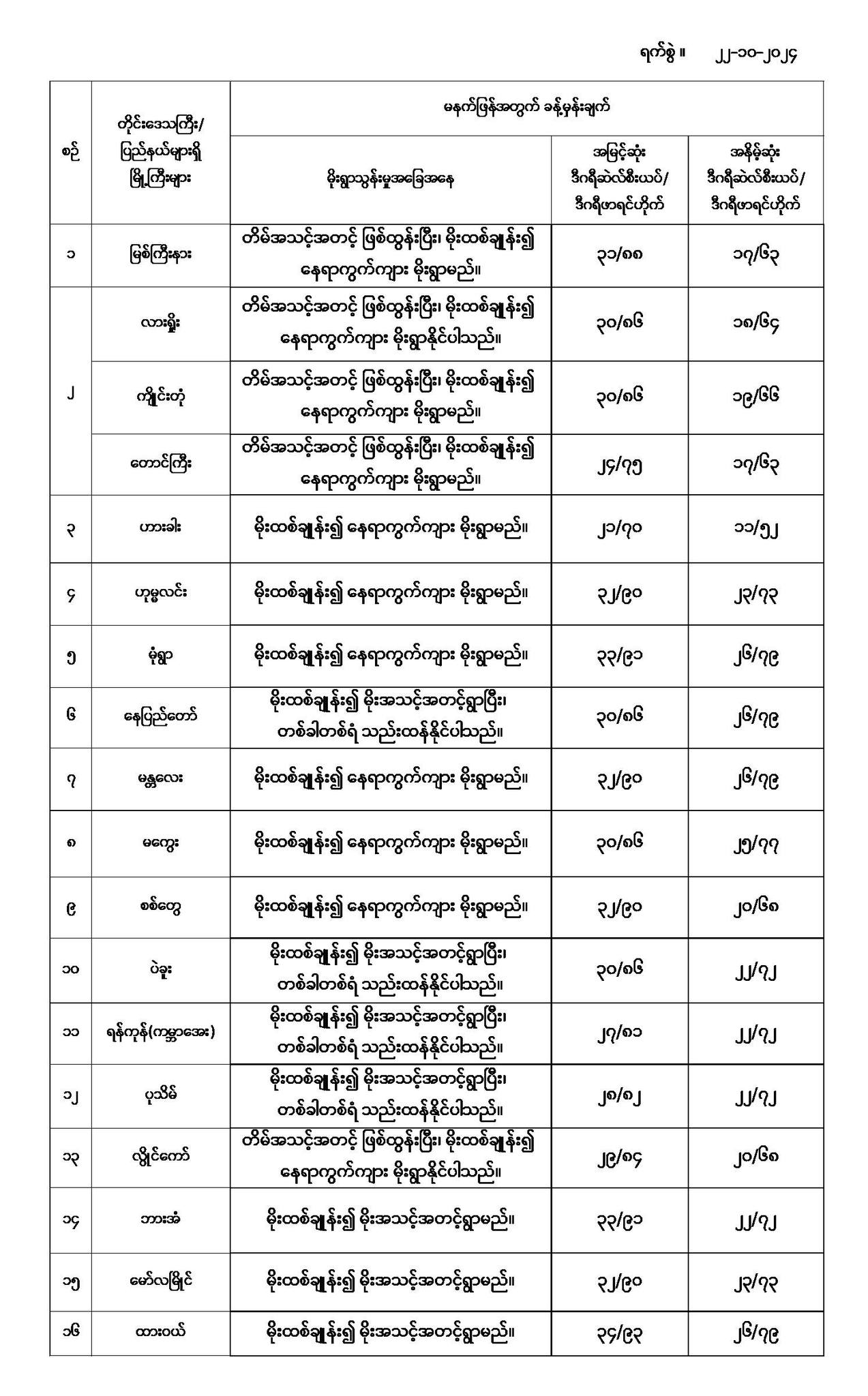 မနက်ဖြန်အတွက် တိုင်းဒေသကြီးနှင့် ပြည်နယ်များရှိ မြို့ကြီးများ၏ အမြင့်ဆုံးအပူချိန်၊ အနိမ့်ဆုံးအပူချိန်နှင့် မိုးလေဝသခန့်မှန်းချက်