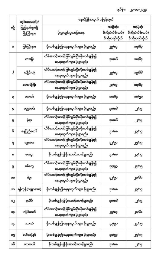 မနက်ဖြန်အတွက် တိုင်းဒေသကြီးနှင့် ပြည်နယ်များရှိ မြို့ကြီးများ၏ အမြင့်ဆုံးအပူချိန်၊ အနိမ့်ဆုံးအပူချိန်နှင့် မိုးလေဝသခန့်မှန်းချက်